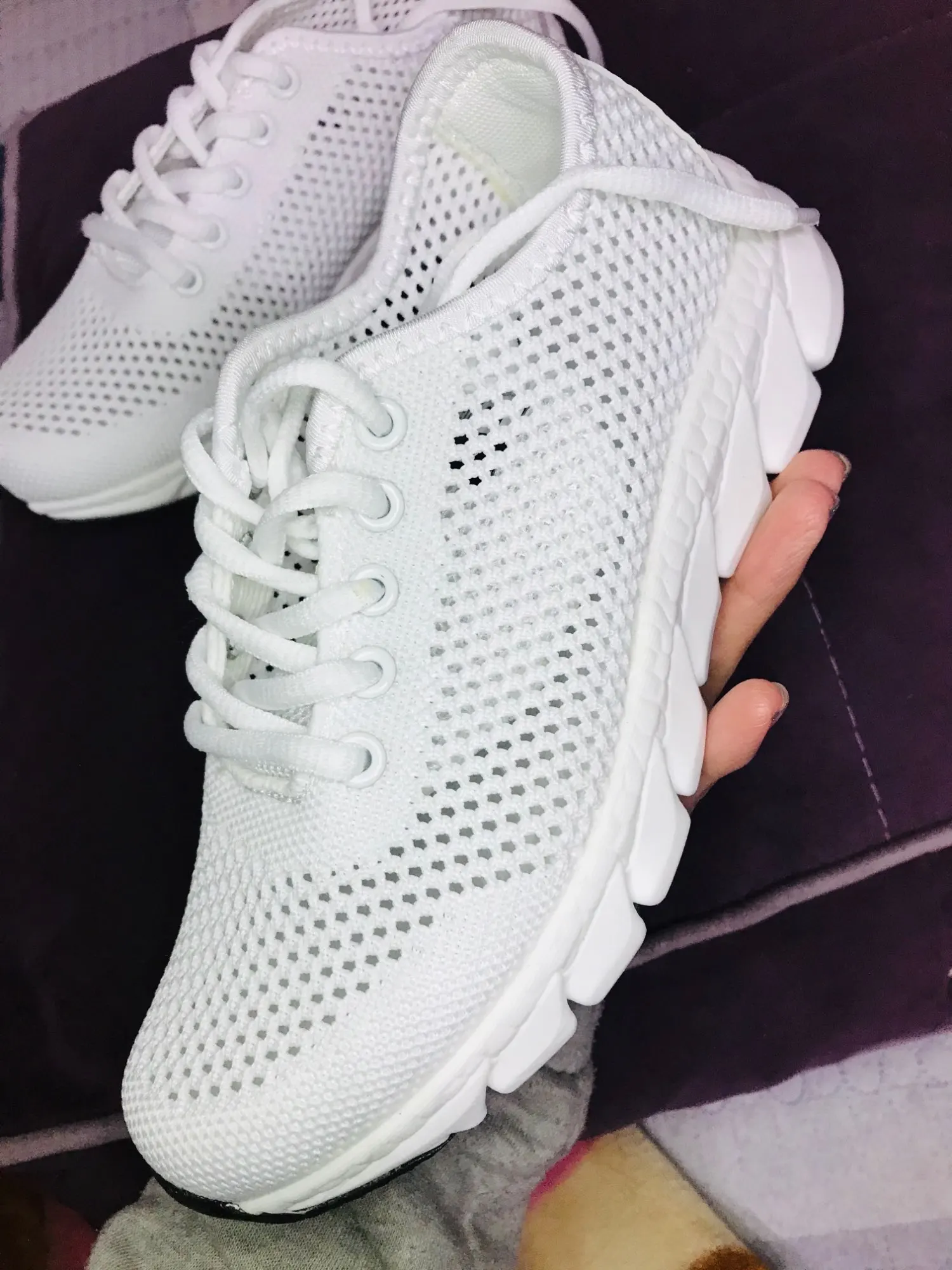 Классные кроссовки, ярко белого цвета. Легкие, на ногах не чувствуется. Размер 9 на наш российский размер 39,5. Идеально подошли. Отправка быстро, доставка чуть больше месяца. Сеточка, ноги дышат. Рекомендую. Довольна. Большое спасибо