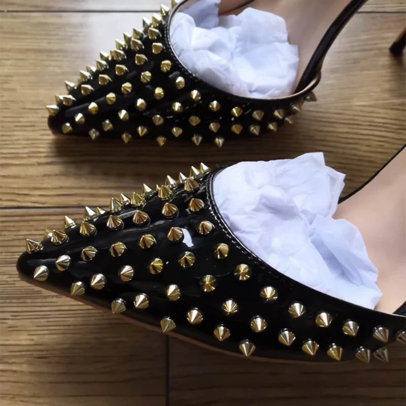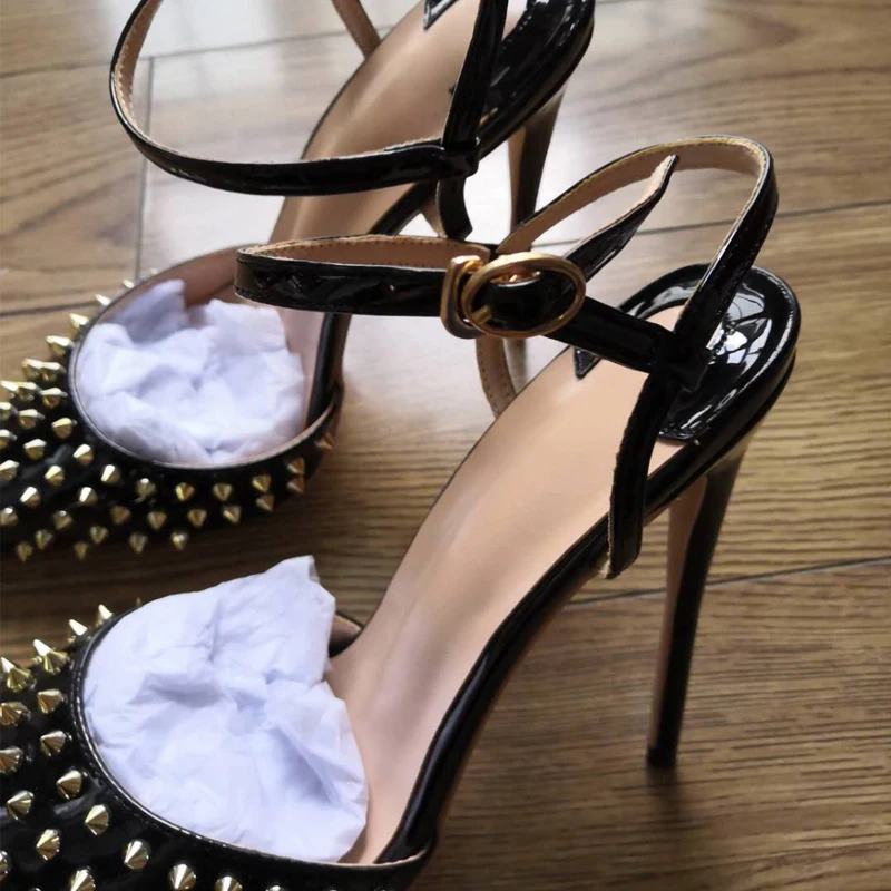 Летние пикантные женские босоножки на высоком каблуке 12 см; Черные женские босоножки из искусственной кожи с заклепками; Пикантная обувь; Женская обувь на шпильке; LX004 ROVICIYA