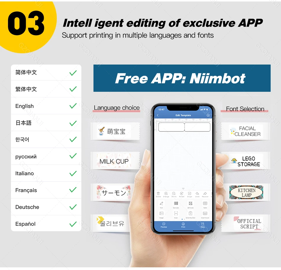 Беспроводной дизайн, поддержка печати на больших расстояниях.Расстояние беспроводной связи до 10 м.Прямой термический, без чернил, тонера или лент.Поддерживает все основные форматы этикеток: цена, дата, размер, вес, имя и т. Д.Универсальный, простой в использовании.Компактный и легкий, удобный для переноски.Аккумулятор емкостью 1200 мАч поддерживает длительное использование.Характеристики: