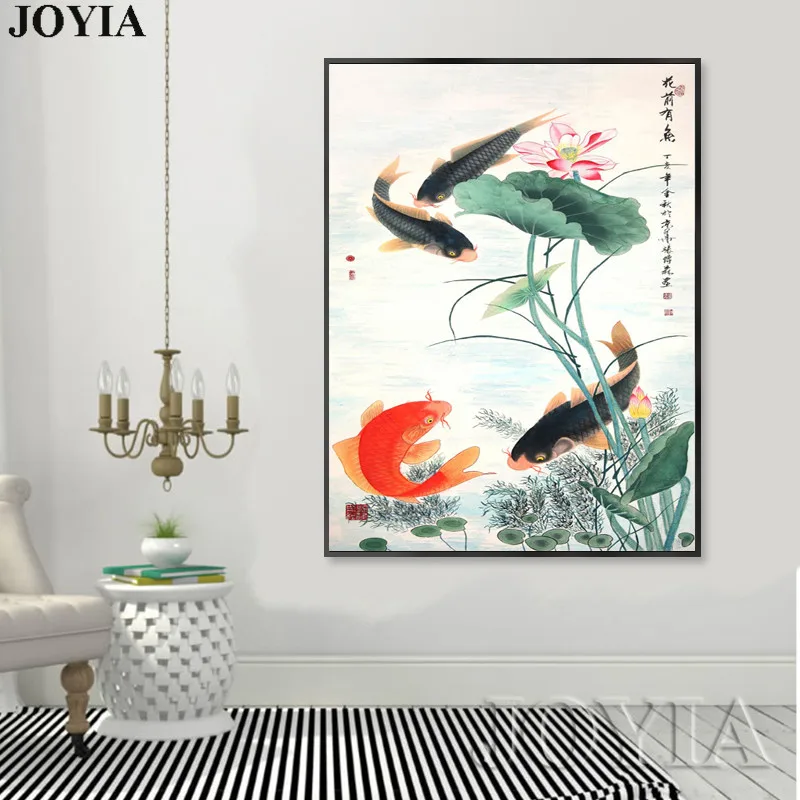 Винтажная настенная художественная картина с цветком лотоса, традиционная цветная картина с изображением рыбы кои для каллиграфии, декор для гостиной и кабинета, без рамки