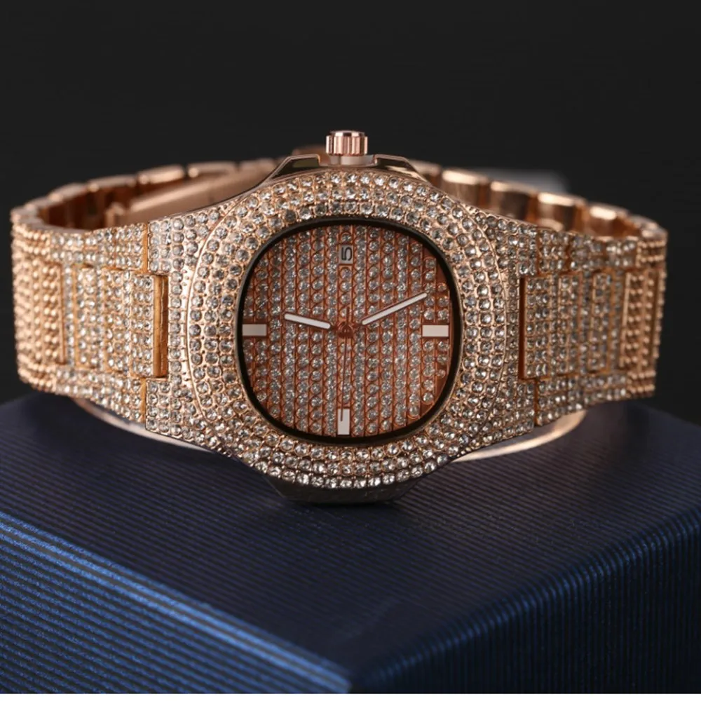 Часы мужские кварцевые с золотым ледяным покрытием, с календарем