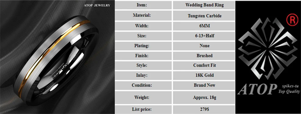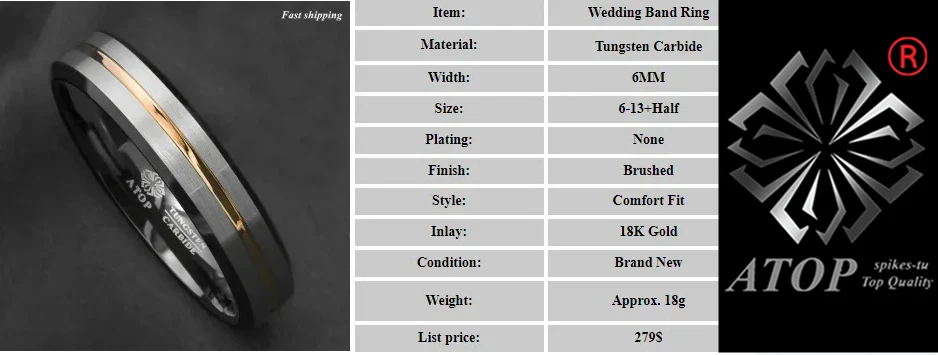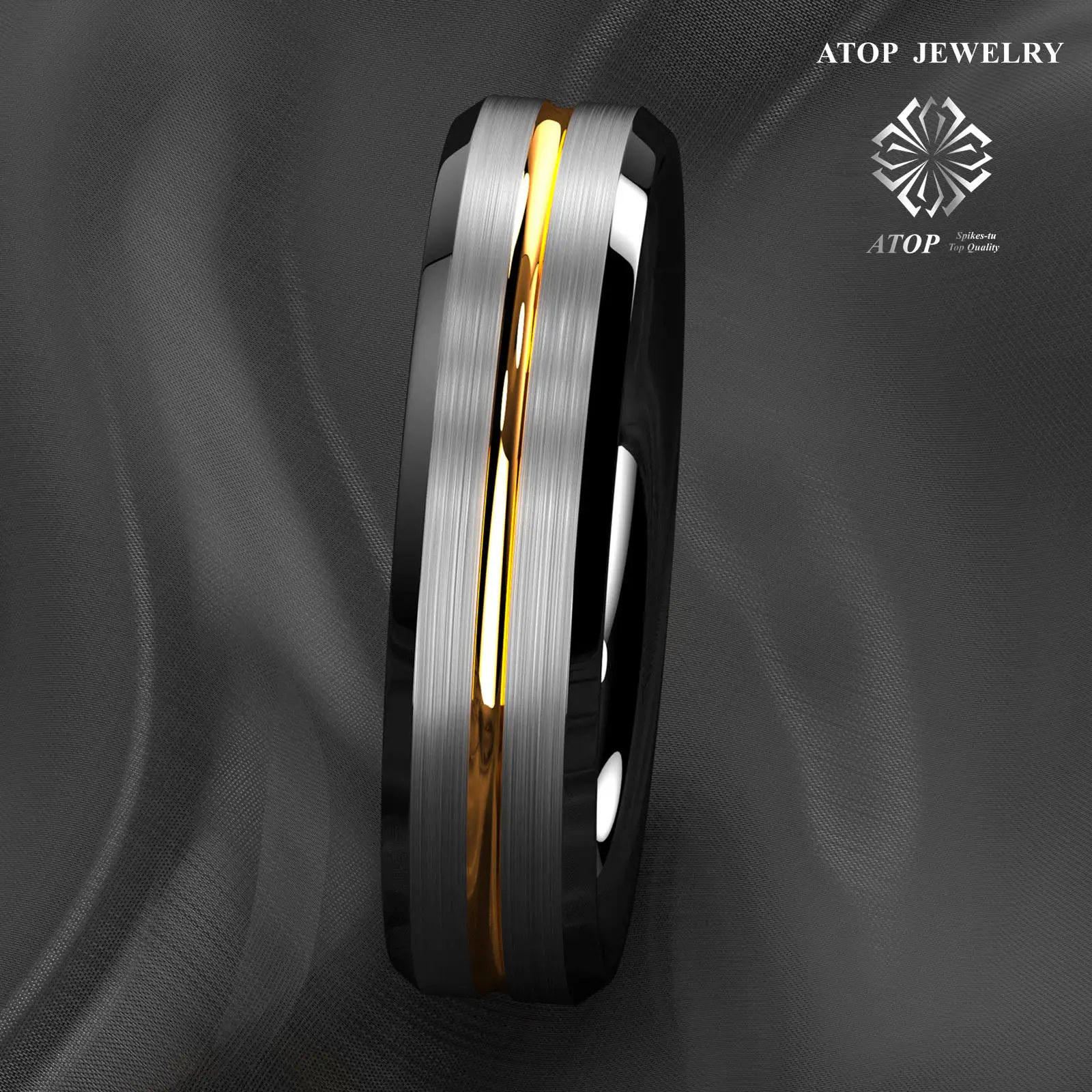 Вольфрамовое мужское кольцо Золотое обручальное кольцо 6 мм купол С...