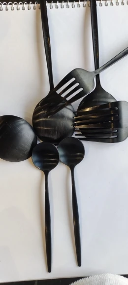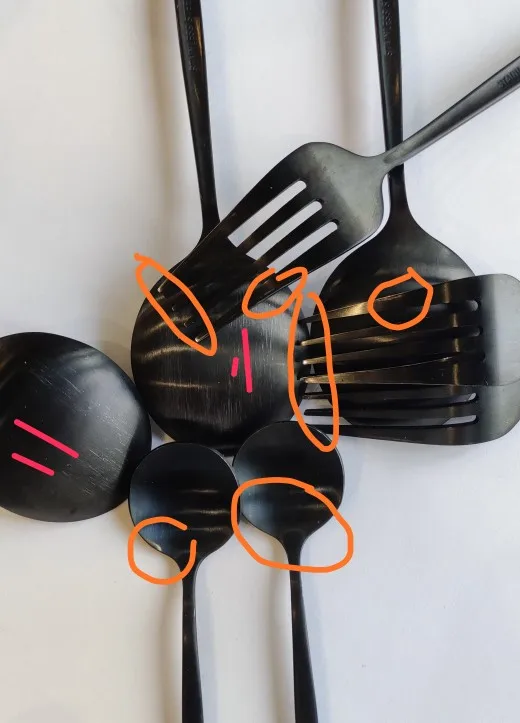 Во-первых, приборы не матовые. Во-вторых слазит краска при мытьё в посудомойке, в-третьих ложка имеет острые края, есть ей проблематично.