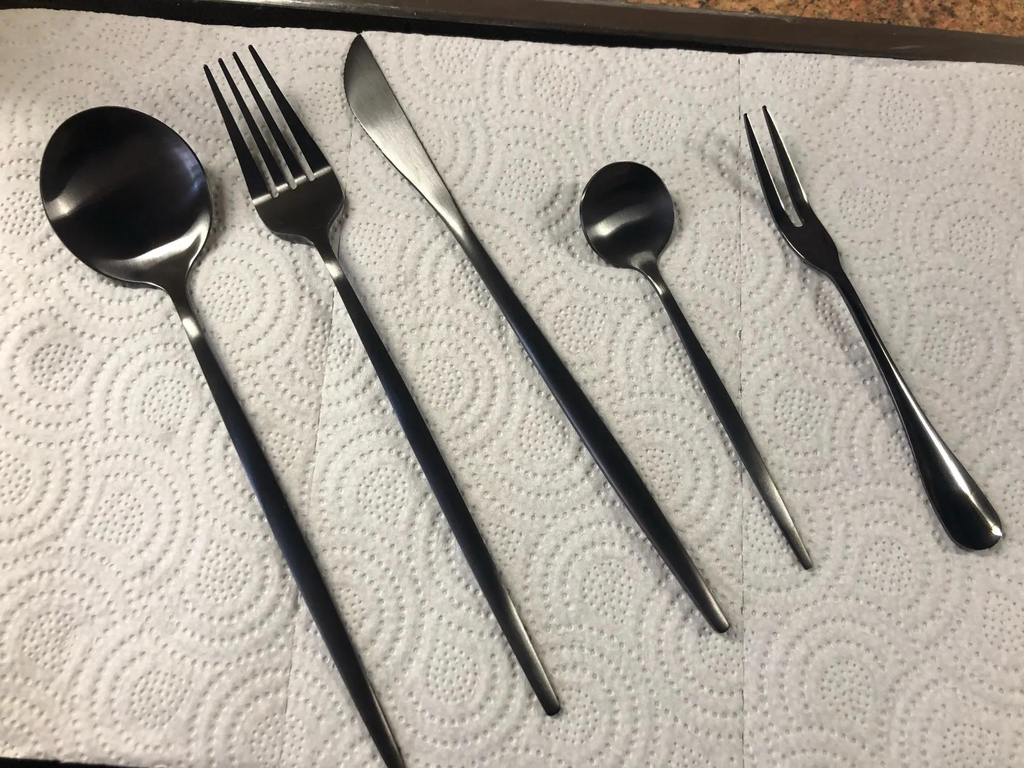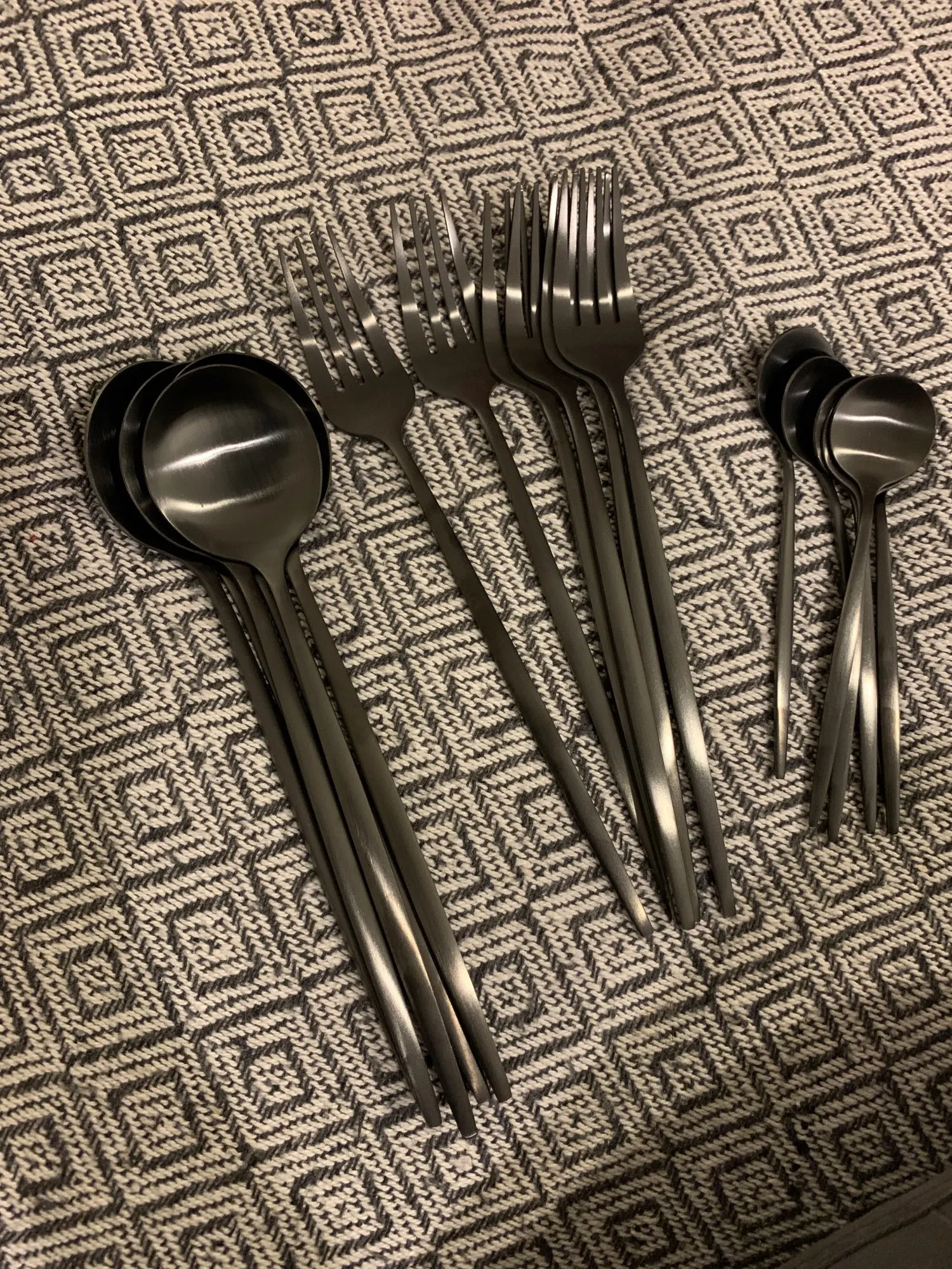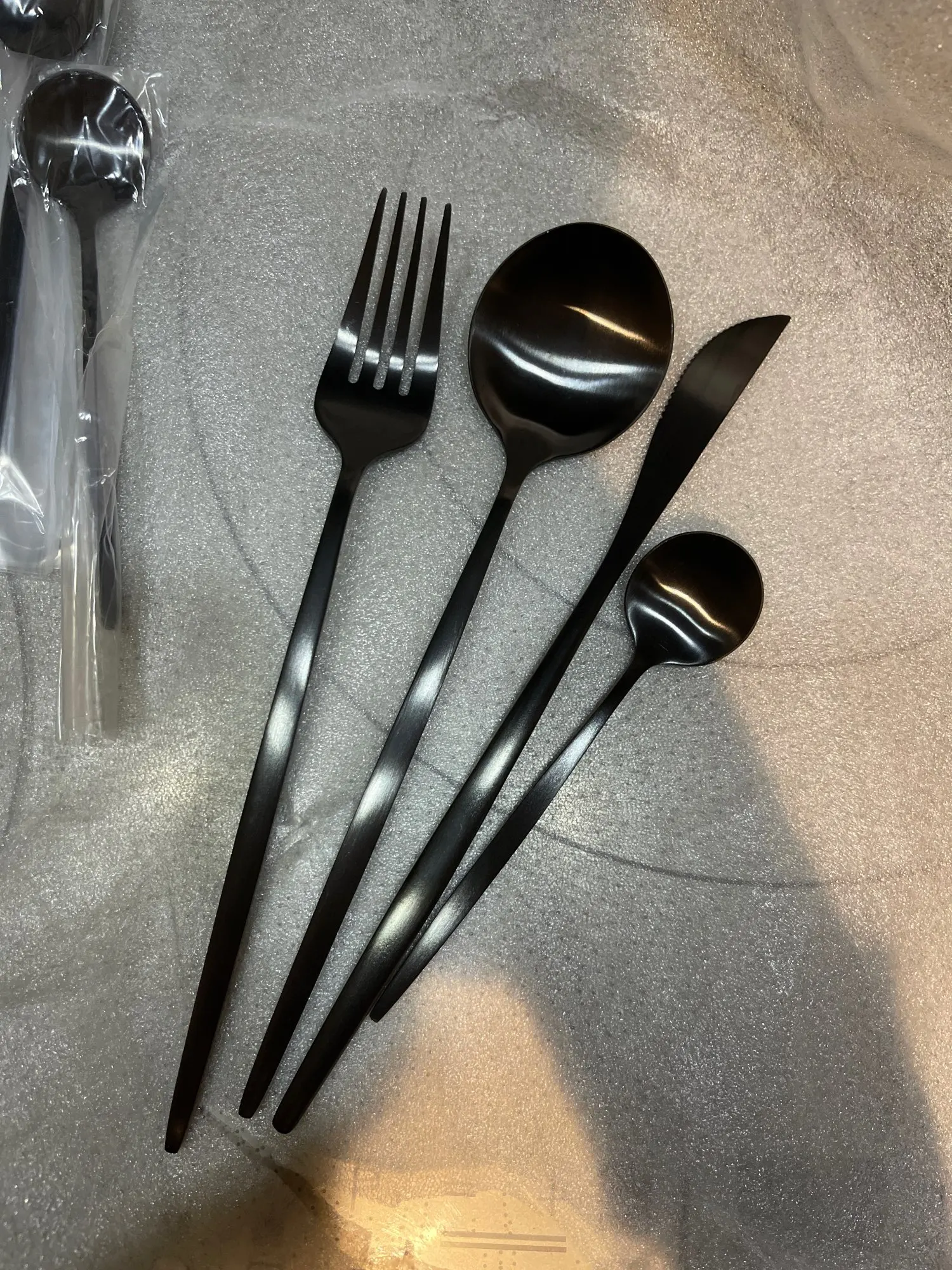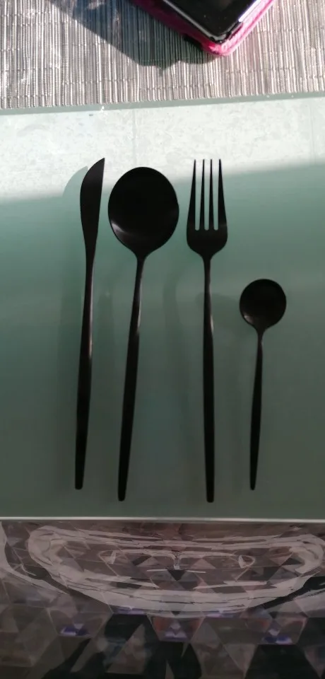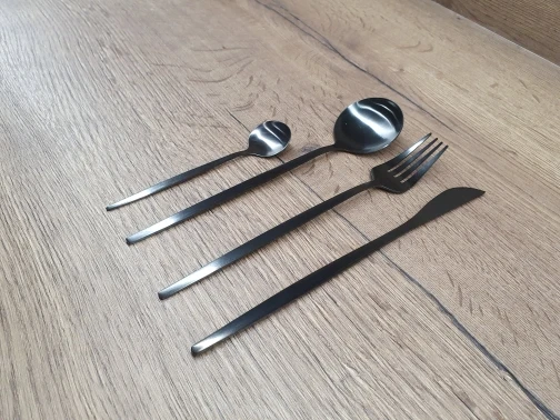 Заказ пришёл оооочень быстро, буквально 1,5 недели не больше до МО, набор потрясающий, цвет матовый чёрный, как хотела. В посудомойке не мыла, но обычное мытьё на отлично, никакого налёта нет. И, как оказалось, ложки очень удобные!
