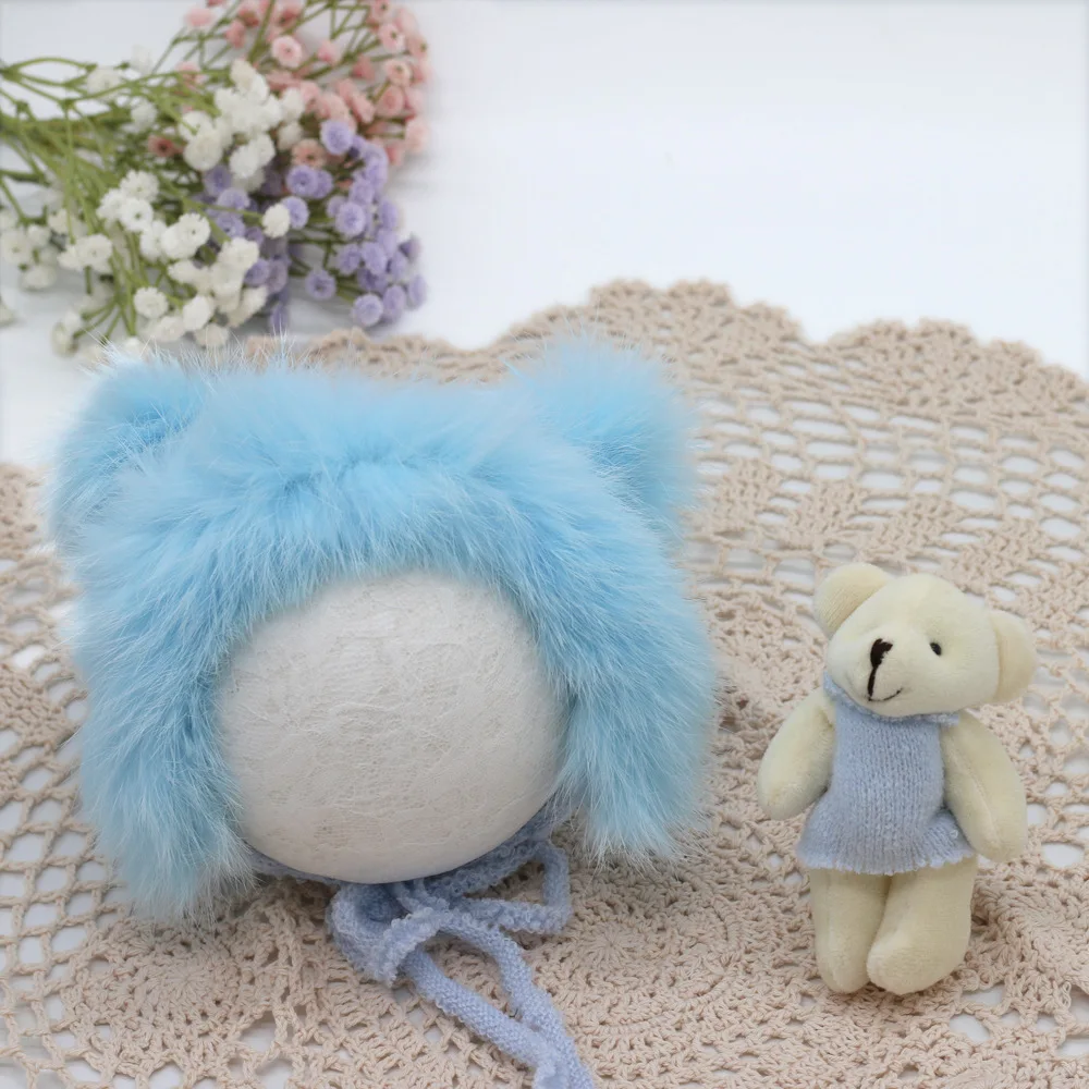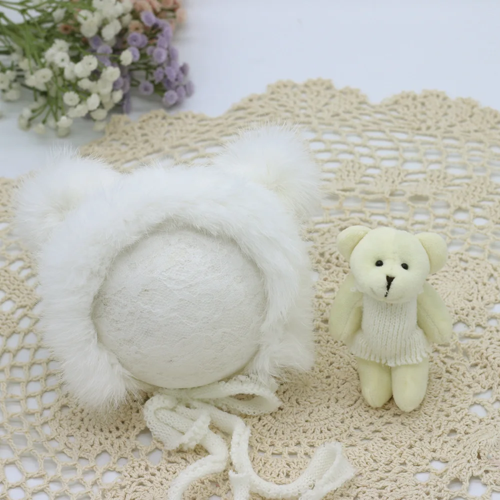 Реквизит для фотосъемки новорожденных шапка, вязаная шапка из кроличьего меха и кукла-медведь.