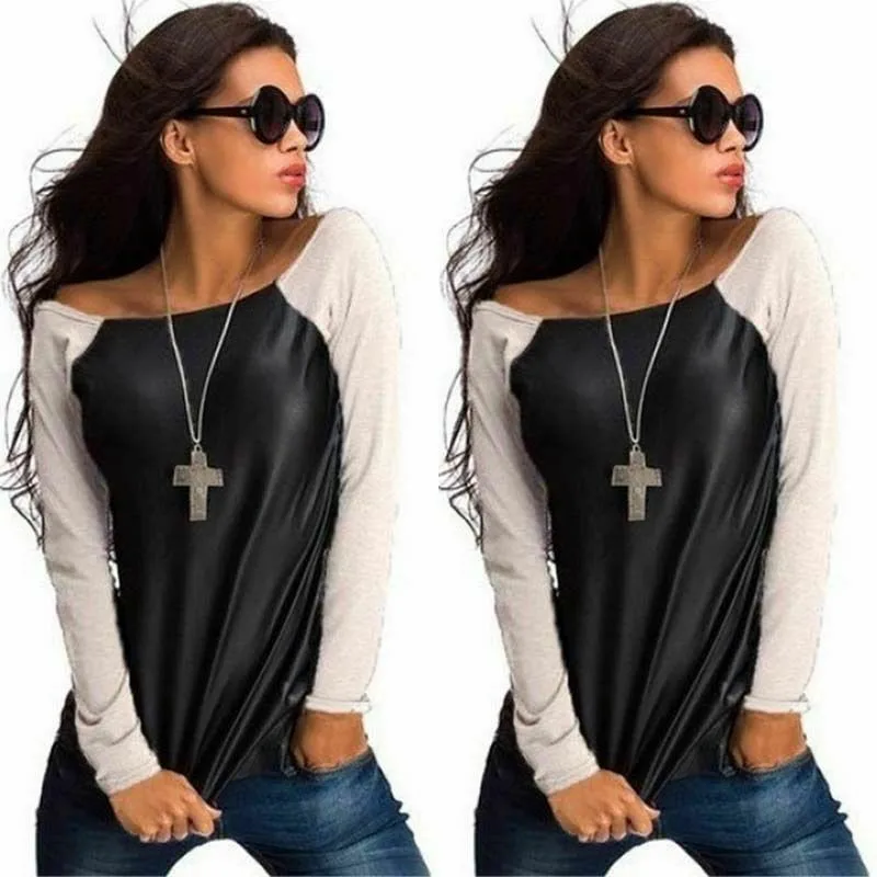 Женские свободные футболки, модные кожаные Лоскутные Топы, новая женская одежда, летние повседневные рубашки с длинным рукавом, футболки Blusa