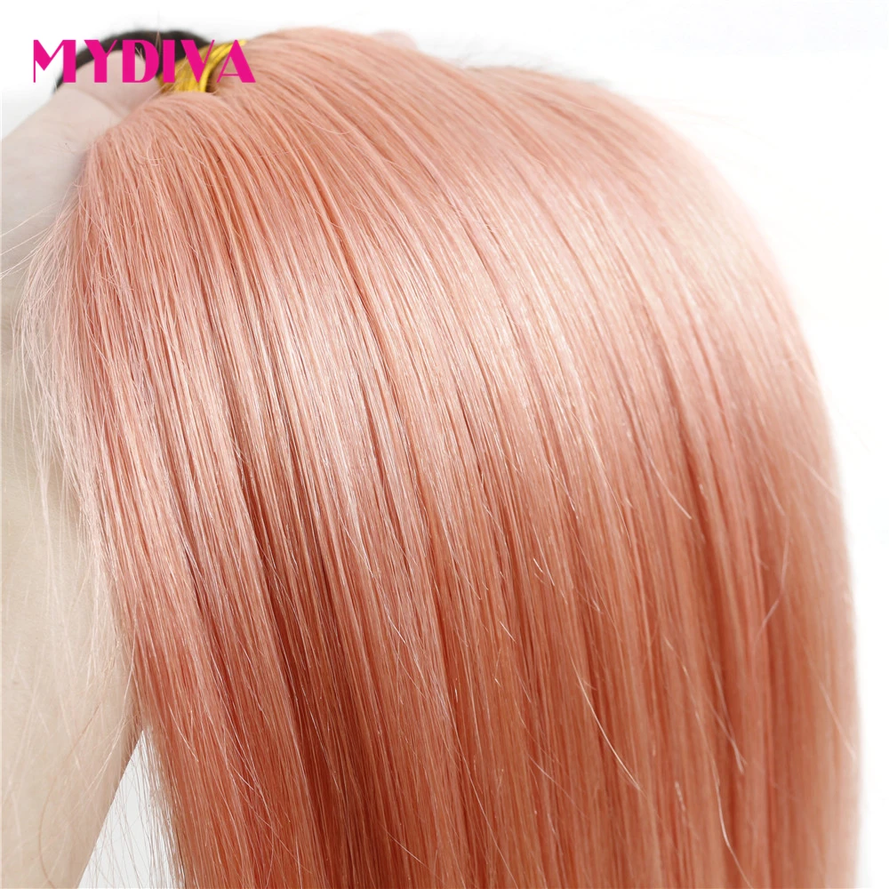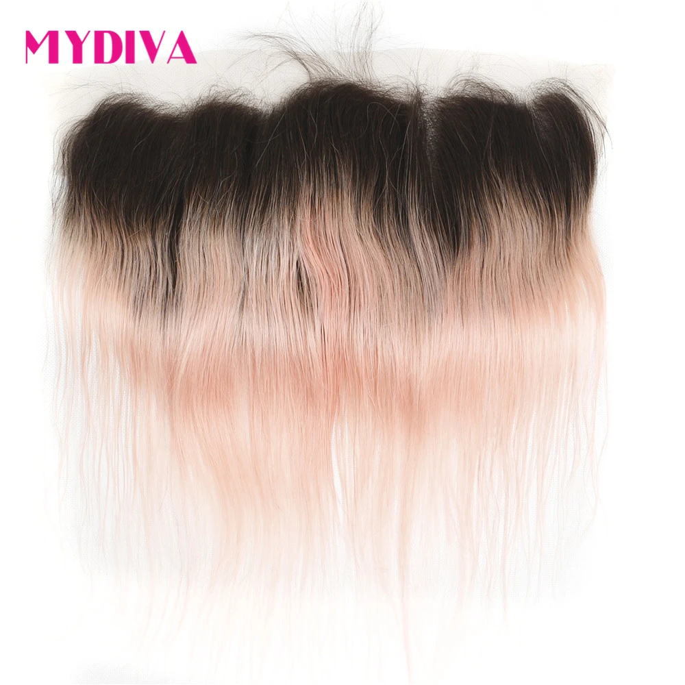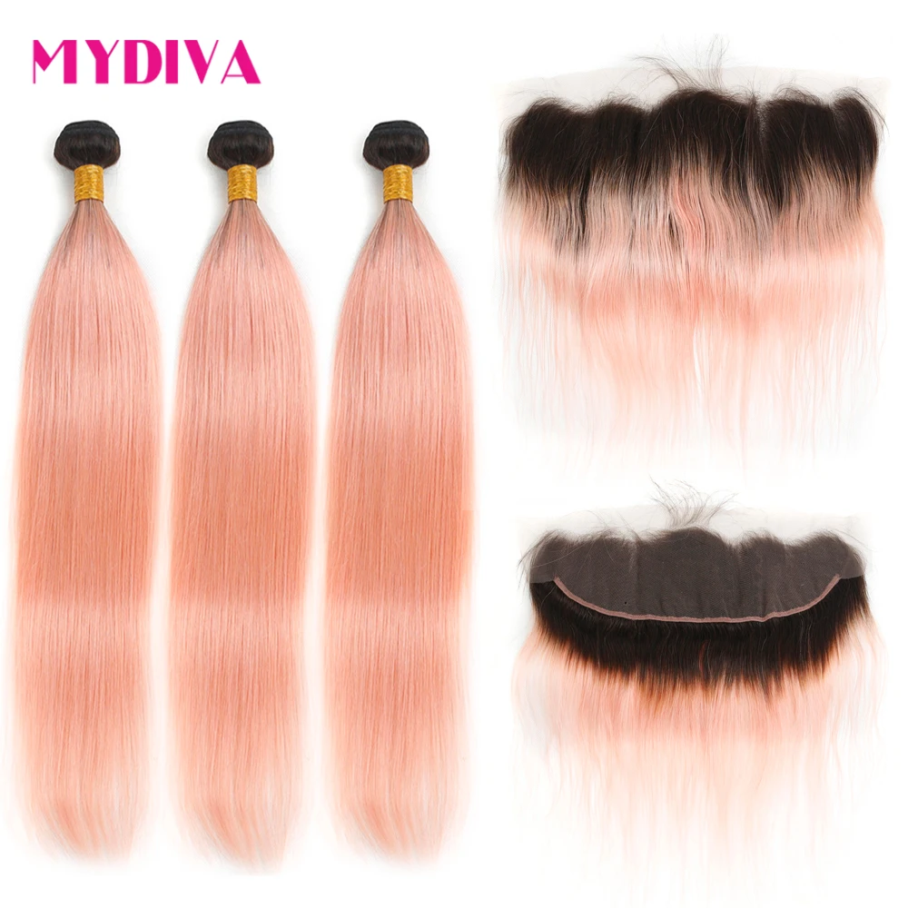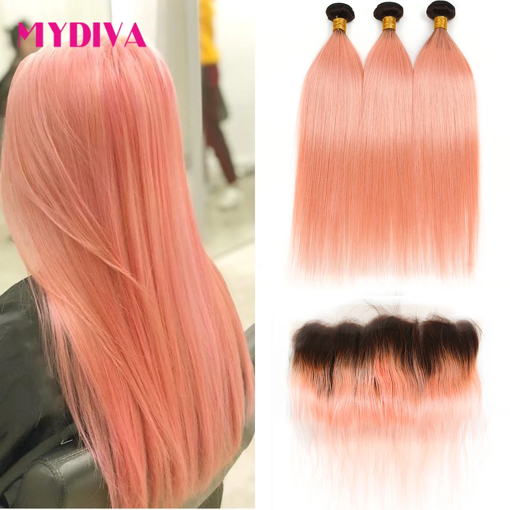 1Bрозовые пряди с фронтальной бразильской прямой Remy натуральные кудрявые пучки волос темные корни розовые человеческие волосы пряди с фронтальной