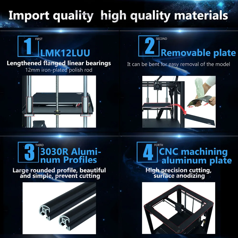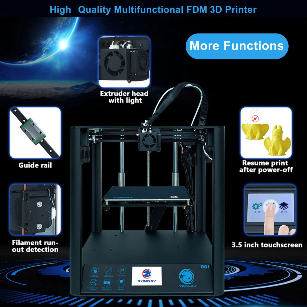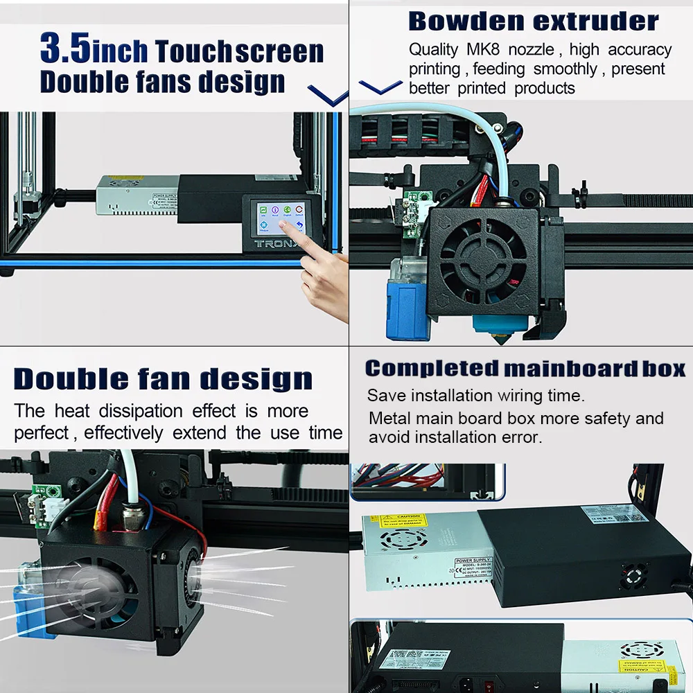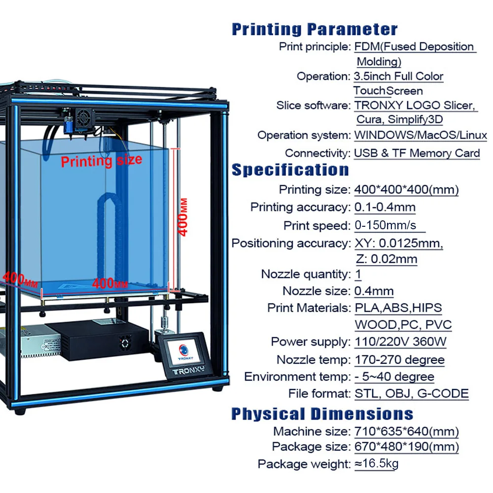 Особенности:3,5 дюймовый сенсорный экран, удобный и простой в эксплуатации; Двойные вентиляторы дизайн.Mk8 сопло, высокая точность печати, подача плавно, лучшее качество печати.Улучшенный качественный шкив, стабильное движение, низкий уровень шума, высокая точность печати.Поддержка обнаружения нити заканчивается, когда материал заканчивается, это напомнит вам изменить новую нить.С функцией повторной печати вы можете продолжить печать после восстановления питания.Функция автоматического выравнивания сенсора, высокая точность и высокая надежность.Макс. 400*400*400 мм размер печати, поддержка PLA,ABS,HIPS,WOOD,PETG, гибкие и другие материалы.В особый период, если вы заинтересованы, вы можете попробовать напечатать свои собственные маски или очки с 3d-принтером, чтобы дать вам и вашим близким и друзьям гарантию безопасности.Характеристики:Название бренда: TronxyВилка: ЕСМатериал оправы: алюминиевый профильВходная мощность: 110 В/220 ВВыходная мощность: 24 В постоянного токаКоличество сопла: 1Сопло Диаметр: 0,4 ммРазмер печати: 400*400*400 мм (макс.)Толщина слоя: 0,1-0,4 ммТочность позиционирования оси XY: 0,0125 ммТочность позиционирования оси Z: 0,02 ммСкорость печати: 0-150 мм/сек.Температура сопла: 270 ℃Температура платформы: 110 ℃ЖК-экран: ДаПодключение: tf-карта/USBНити Диаметр: 1,75 ммМатериал нити: PLA,ABS,HIPS,WOOD,PETG,FLEXIBLEЯзык: английский, китайскийПечать формата файла: STL, g-код и т. Д.Операционная система: Windows,Linux,MacOSПрограммное обеспечение хоста: Repetier-Host,Cura,Simplify3DРазмер машины: 71,0*63,5*64,0 см/28,0*25,0*25,2 дюймаВес машины: 15 кг/33,1 фунтаРазмер посылка: 67,0*48,0*19,0 см/26,4*18,9*7,5 дюймаПосылка Вес: 16,5 кг/36.4lbПосылка:1 * 3D принтер DIY Kit![]()