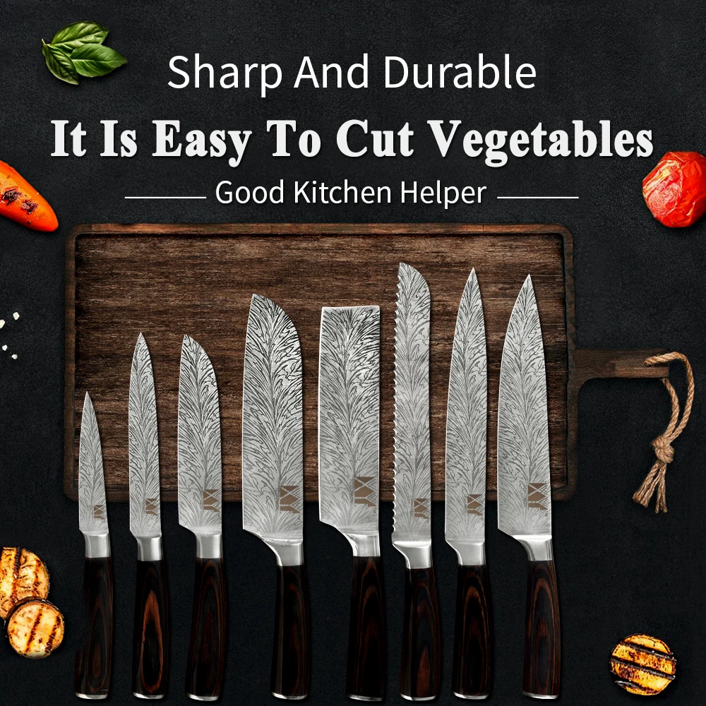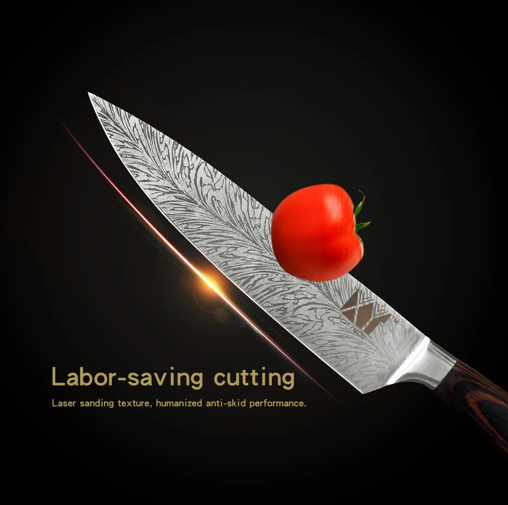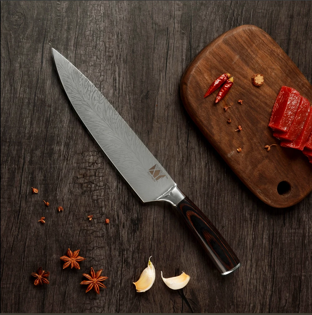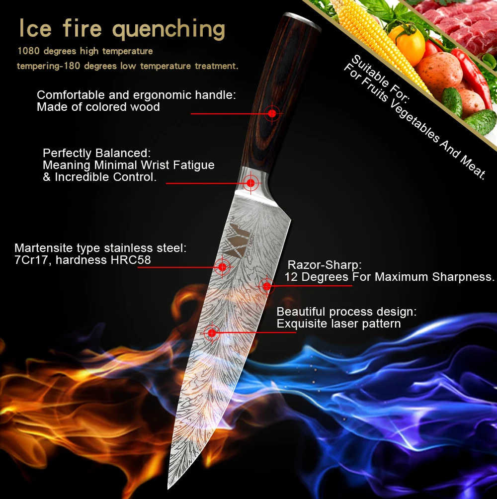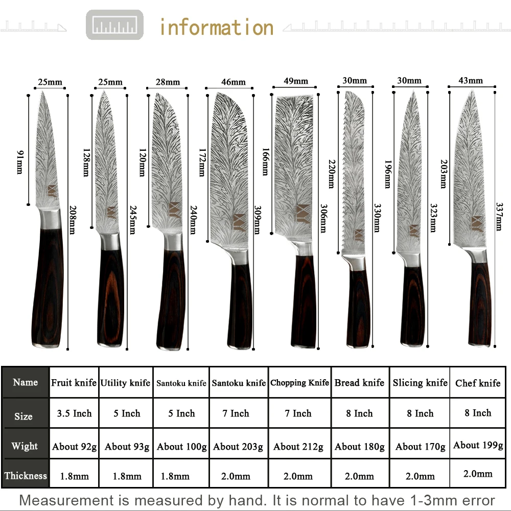 Узор очень похож на дамасский нож. Фактический процесс: лазерная технология. Очень стильный кухонный нож. Размер и вес почти одинаковы, возможны погрешности из-за различных инструментов измерения. Пожалуйста, поймите.