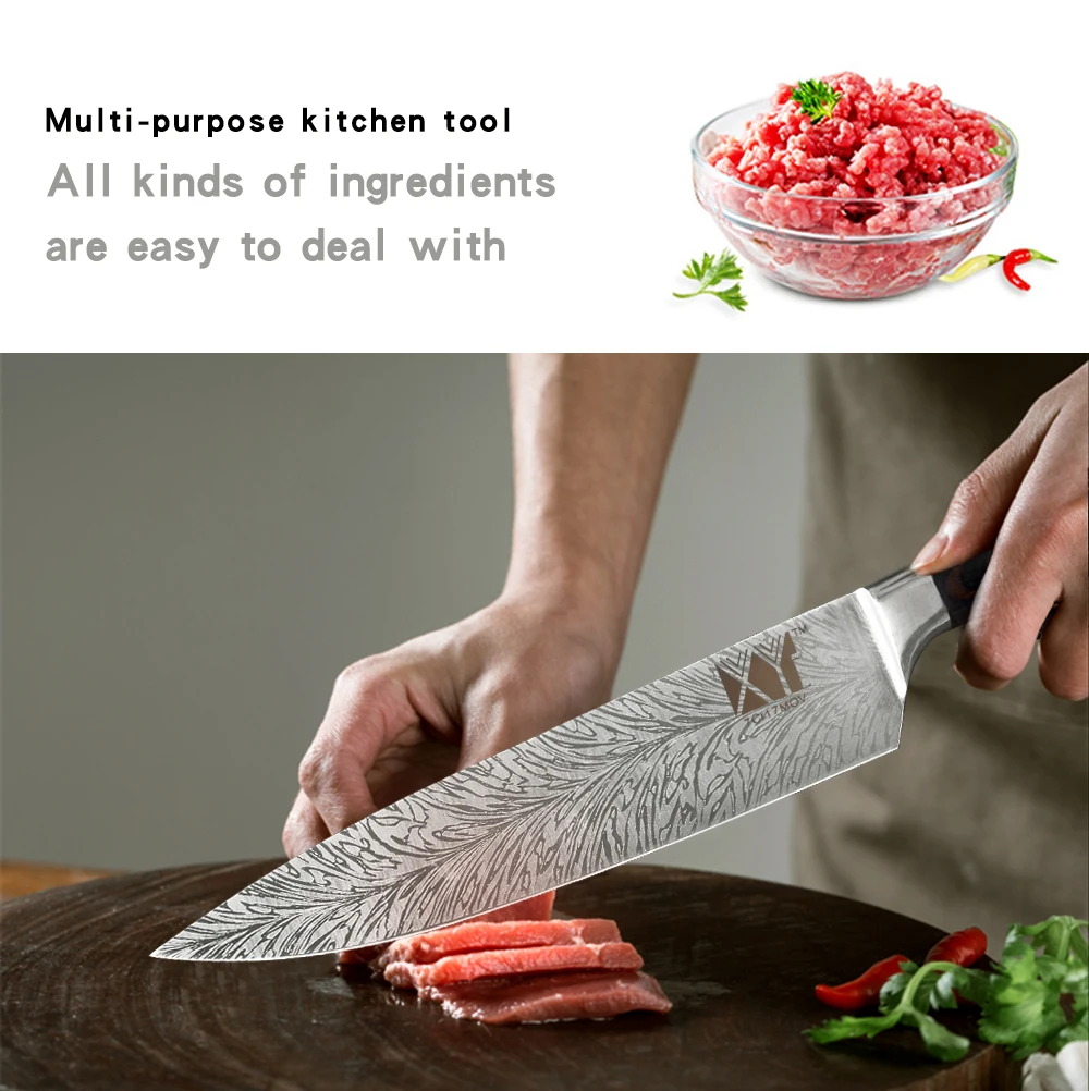 Наборы кухонных ножей XYj из нержавеющей стали с узором в виде перьев, держатель для ножей комплекты с ножом, подставка для ножей, точилка, стержень