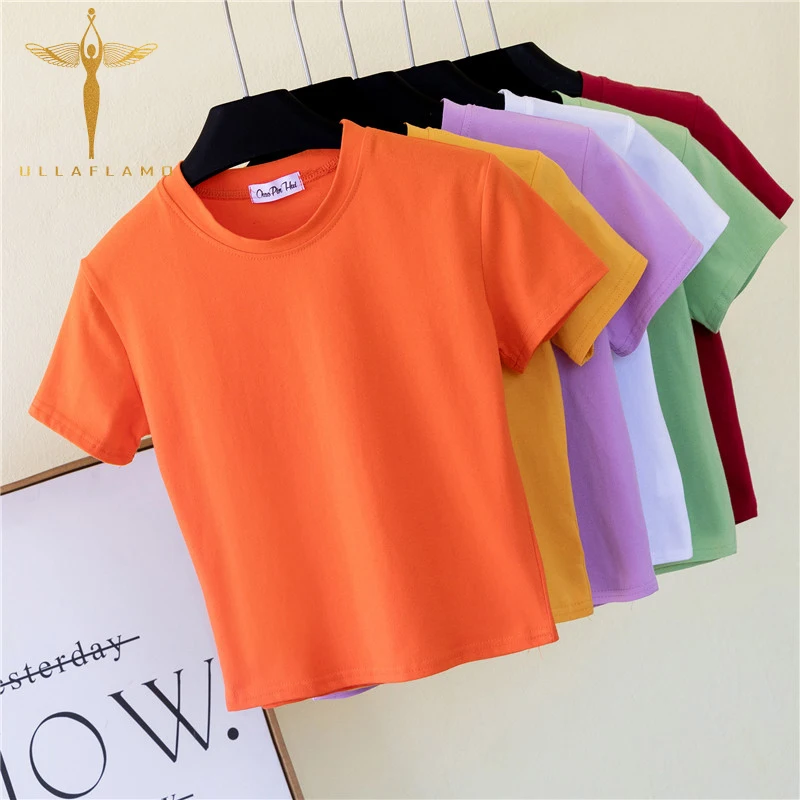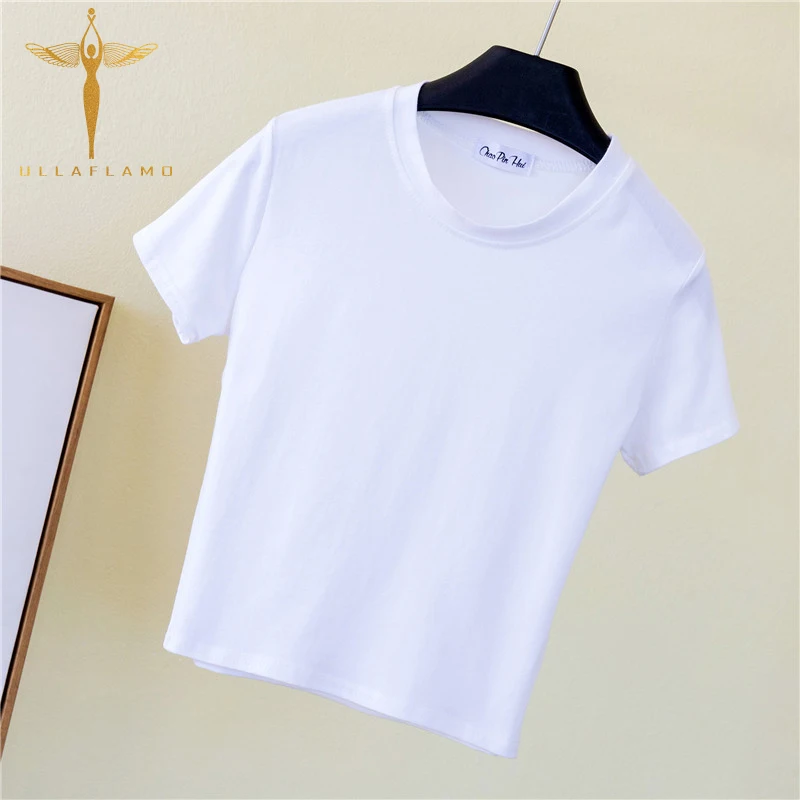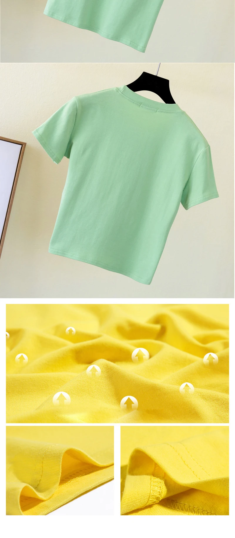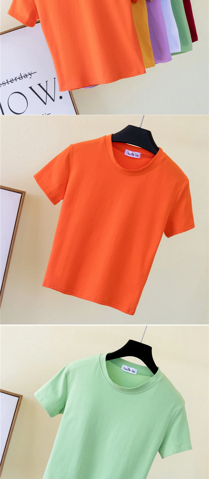 Футболка женская хлопковая, с круглым вырезом, однотонная, с высокой талией