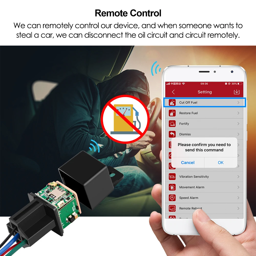 Мы можем управлять нашим устройством дистанционно, и когда кто-то хочет украсть машину, мы можем отключить цепь масла и цепь дистанционно.