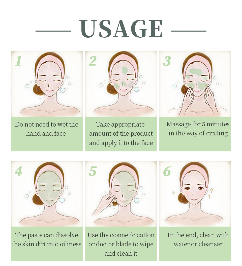 1 не нужно мочить руку и лицо 2. Возьмите необходимое количество продукта и нанесите его на лицо 3 массажа для 5 минут на пути кружения 4. Паста может растворить Косметический хлопок кожи грязи в жирность или клинок доктора для протирания И очистить его 5 в конце, очистите водой или моющим средством