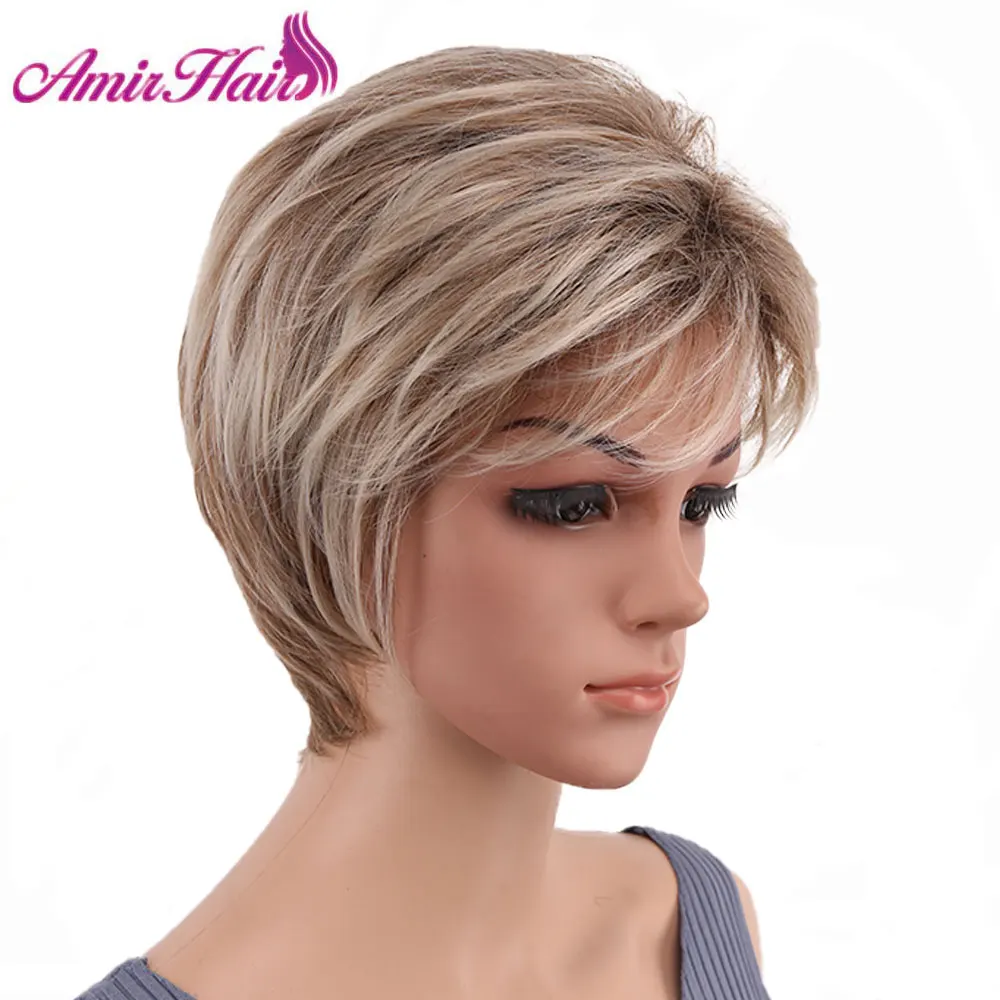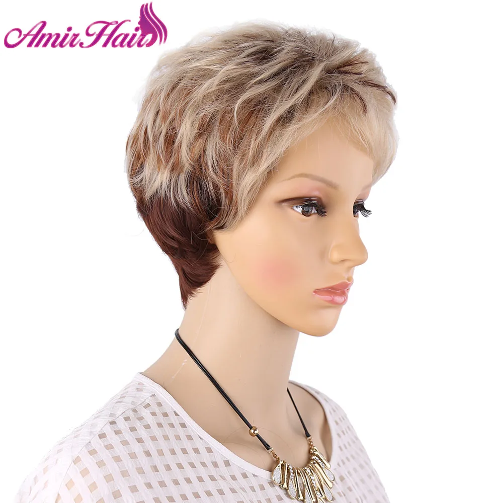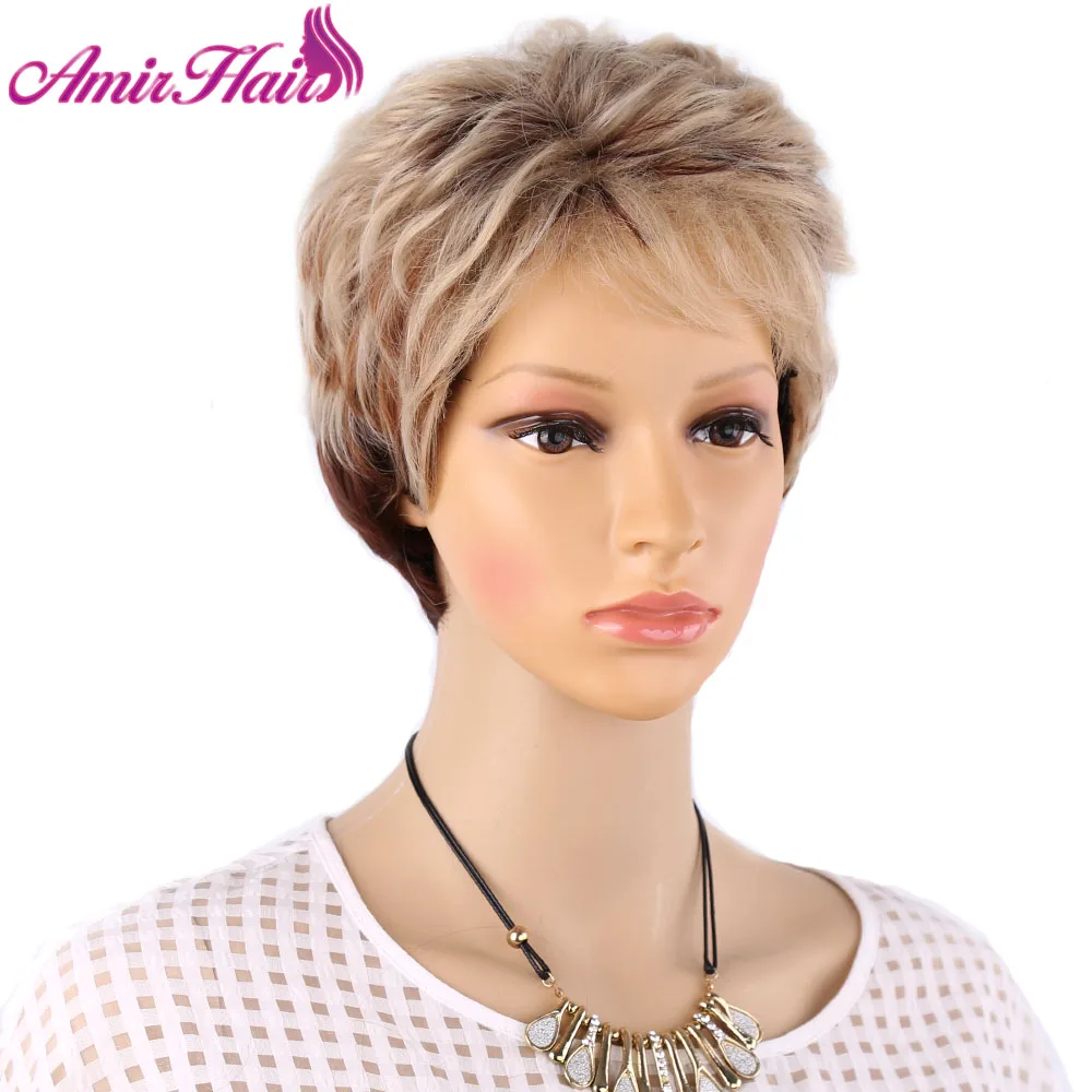 Парик Amir из коротких волос Блонд, многослойные вьющиеся волосы, смешанные прямые волосы для бровей, синтетические мужские парики для косплея Для чернокожих женщин, парик с челкой