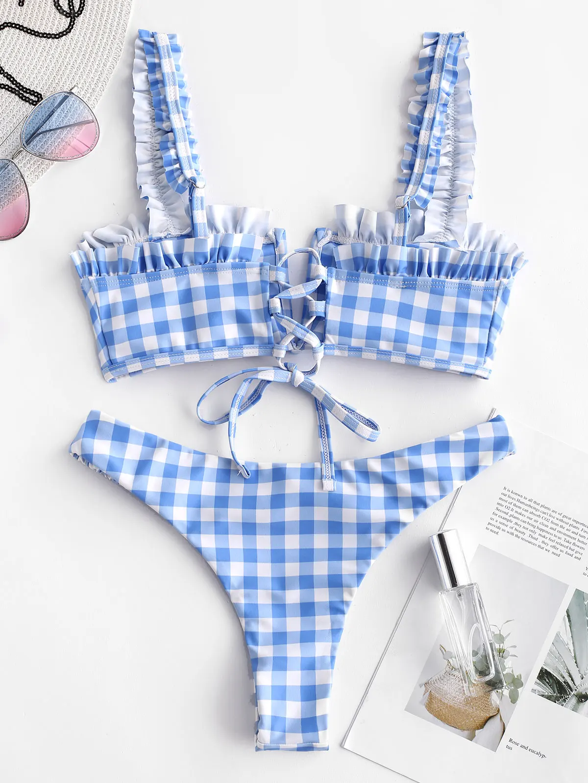 Женский клетчатый комплект бикини ZAFUL, с v-образным вырезом, с рюшами, без косточек, купальники с ремнями, с низкой талией, с подкладкой, летние купальные костюмы из двух предметов