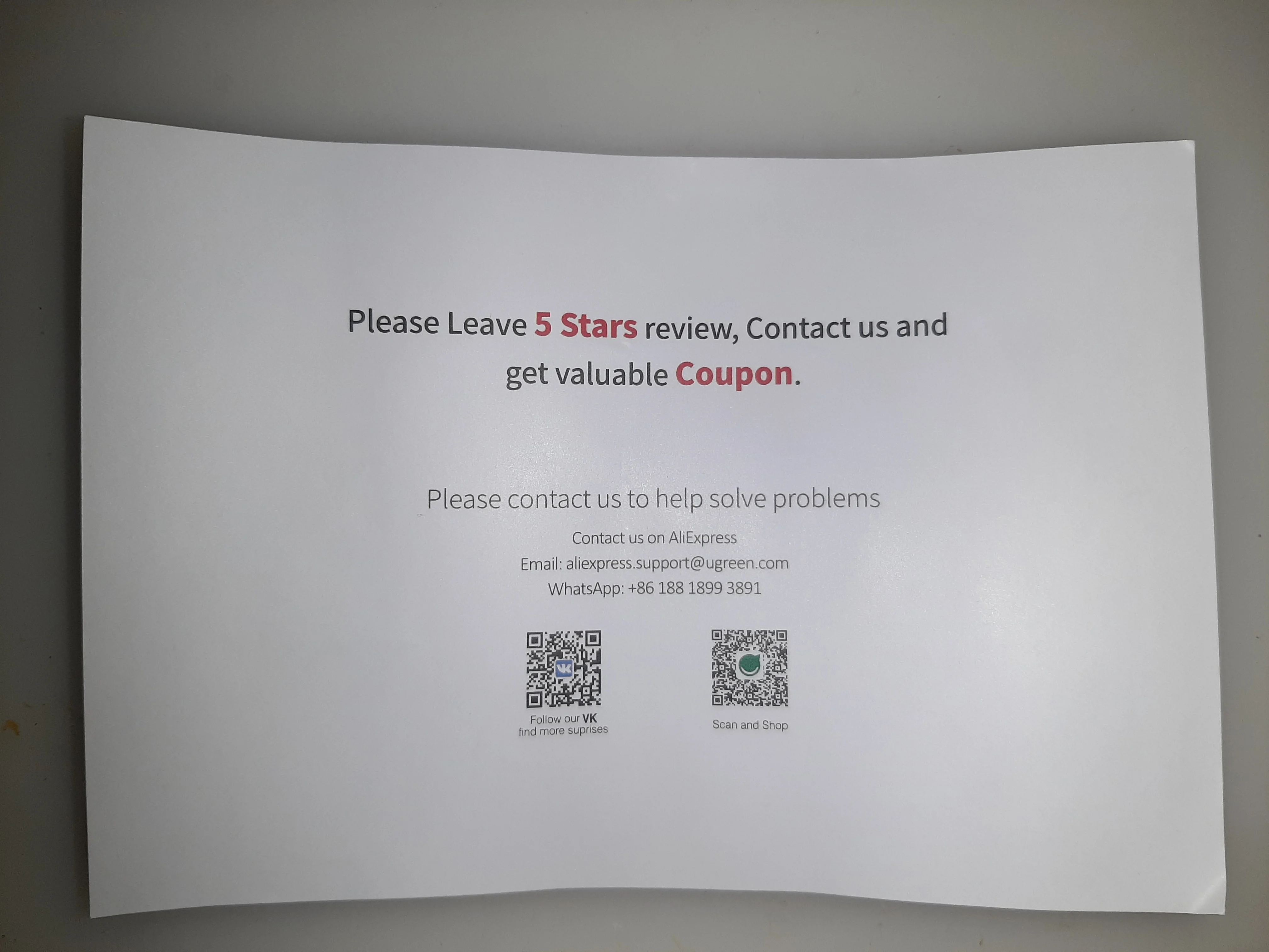 Заказ пришел точно в срок, прогнозируемый во время заказа. Почта России. Качество шнуров и зарядки очень хорошее. Не хочется говорить штампами типа "почти как эппл", но первое впечатление после распаковки именно такое. Штекеры садятся в гнёзда девайсов как бы с легким защелкиванием, проверено на айпаде и гопрохе-5, заряжаются одновременно. Продавец положил рекламный листок на блютус-наушники и маленьким бонусом полоску липучки-органайзера для проводов. Мелочь, а приятно, тем более что как раз задумывался о покупке упаковки таких липучек. Тут продавец очень угадал с маркетингом. Каждый товар упакован в индивидуальный пакет с четкой маркировкой и штрих-кодами, даже липучка. Везде вложены бумажные вкладыши с параметрами, качественно отпечатанные. В общем, однозначно доволен. В дальнейшем, конечно, буду смотреть в сторону UGREEN.
