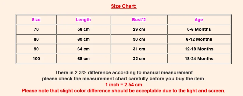 Размеры Длина Бюст * 2 Возраст 70 56 см 29 см 0-6 месяцев 80 60 см 30 см 6-12 месяцев 90 64 см 31 см 12-18 месяцев 100 68 см 32 см 18-24 месяцевРазница в 2-3% в соответствии с измерениями вручную. Прежде чем купить эту товарную позицию, просим тщательно свериться с таблицей размеров. 1 дюйм = 2,54 см Обратите внимание что небольшая разница в цвете считается приемлемой. Это может быть связано с положением источника света и с настройками экрана.