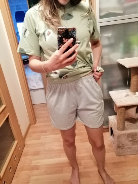Пижама классная, пришла за 3 недели в Подмосковье. Заказывала специально размер побольше, чтобы дома было комфортнее ходить: футболка классно села, не в обтяг, но и не совсем огромная, а вот шорты почти в обтяжечку на бёдра 94
