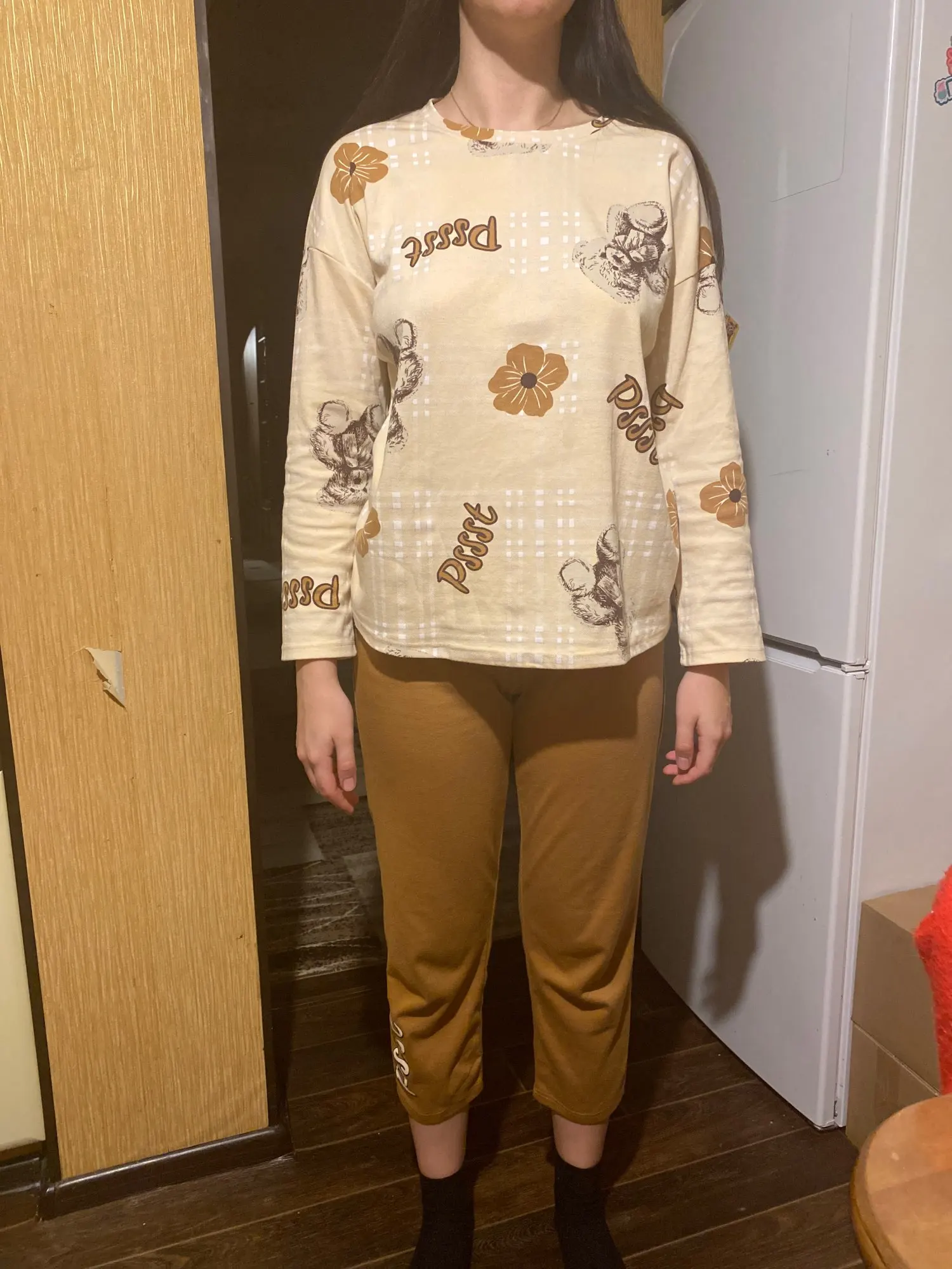 Хорошая пижама, я ростом 156,мне по длине нормально, только кофта немного другого оттенка, но это её не портит
