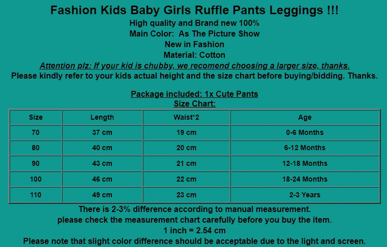 Размер Длина Талия * 2 Возраст 70 37 см 19 см 0-6 месяцев 80 40 см 20 см 6-12 месяцев 90 43 см 21 см 12-18Месяцев 100 46 см 22 см 18-24Месяцев 110 49 см 23 см От 2 до 3 летРазница в 2-3% в соответствии с измерениями вручную. Прежде чем купить эту товарную позицию, просим тщательно свериться с таблицей размеров. 1 дюйм = 2,54 см Обратите внимание что небольшая разница в цвете считается приемлемой. Это может быть связано с положением источника света и с настройками экрана.