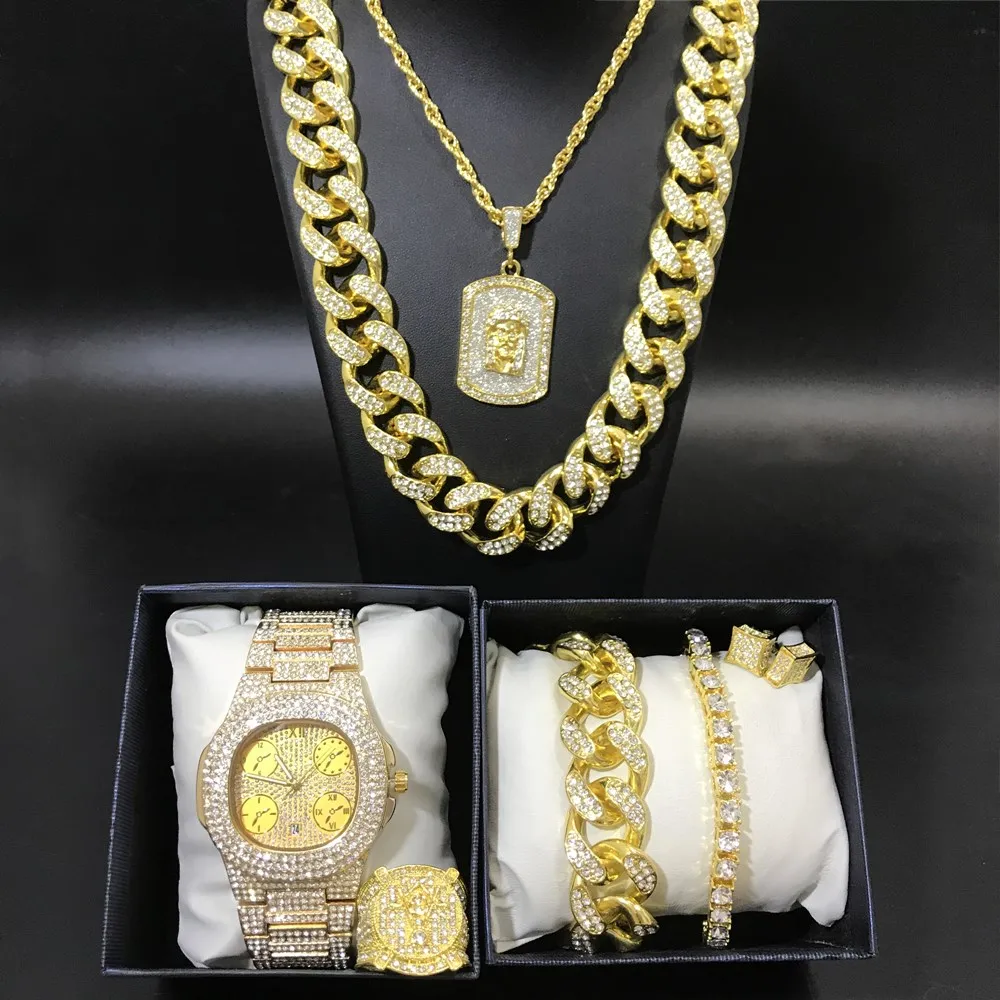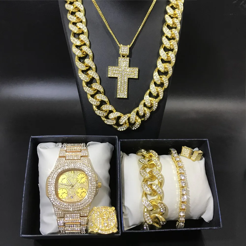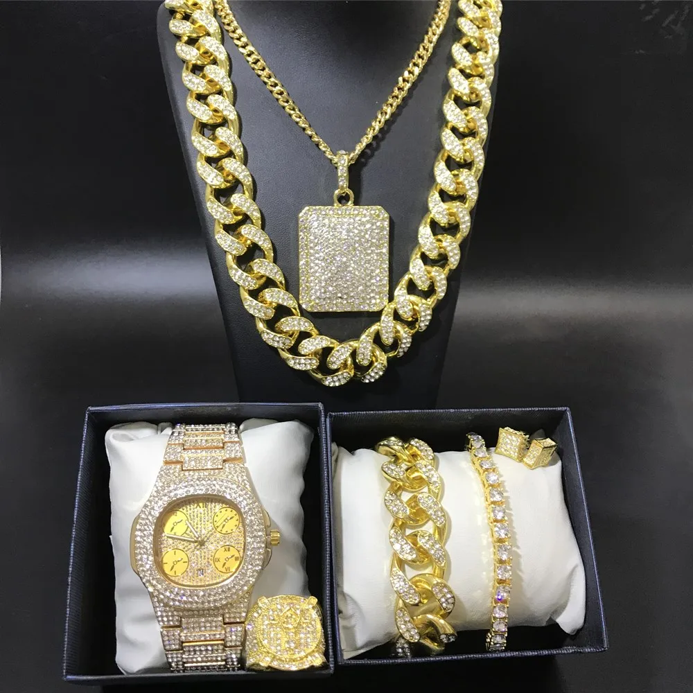 Роскошные мужские часы золотого цвета в стиле хип-хоп, мужские ожерелье, часы, браслеты, кольца и серьги, комплект с кубинской цепью в стиле хип-хоп для мужчин