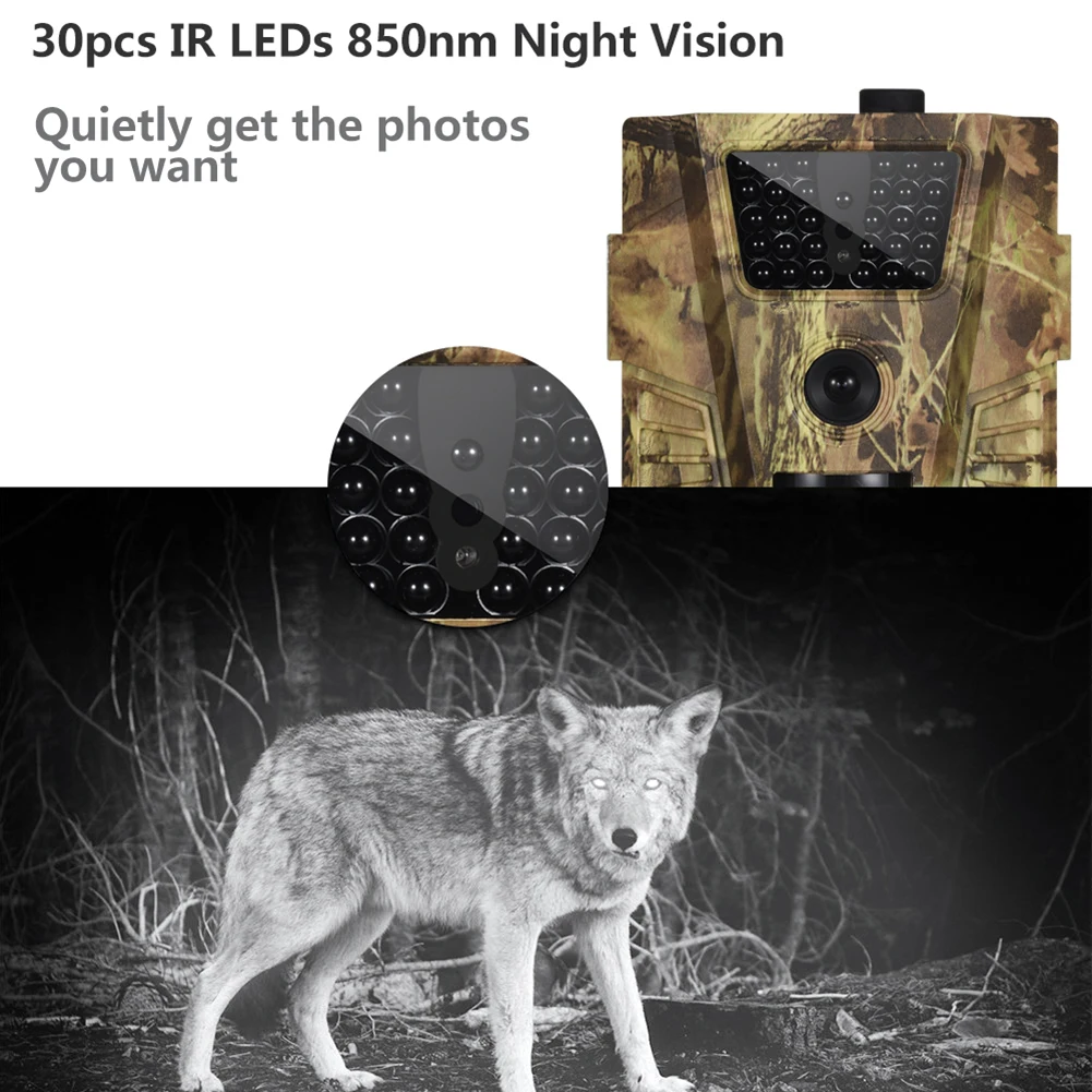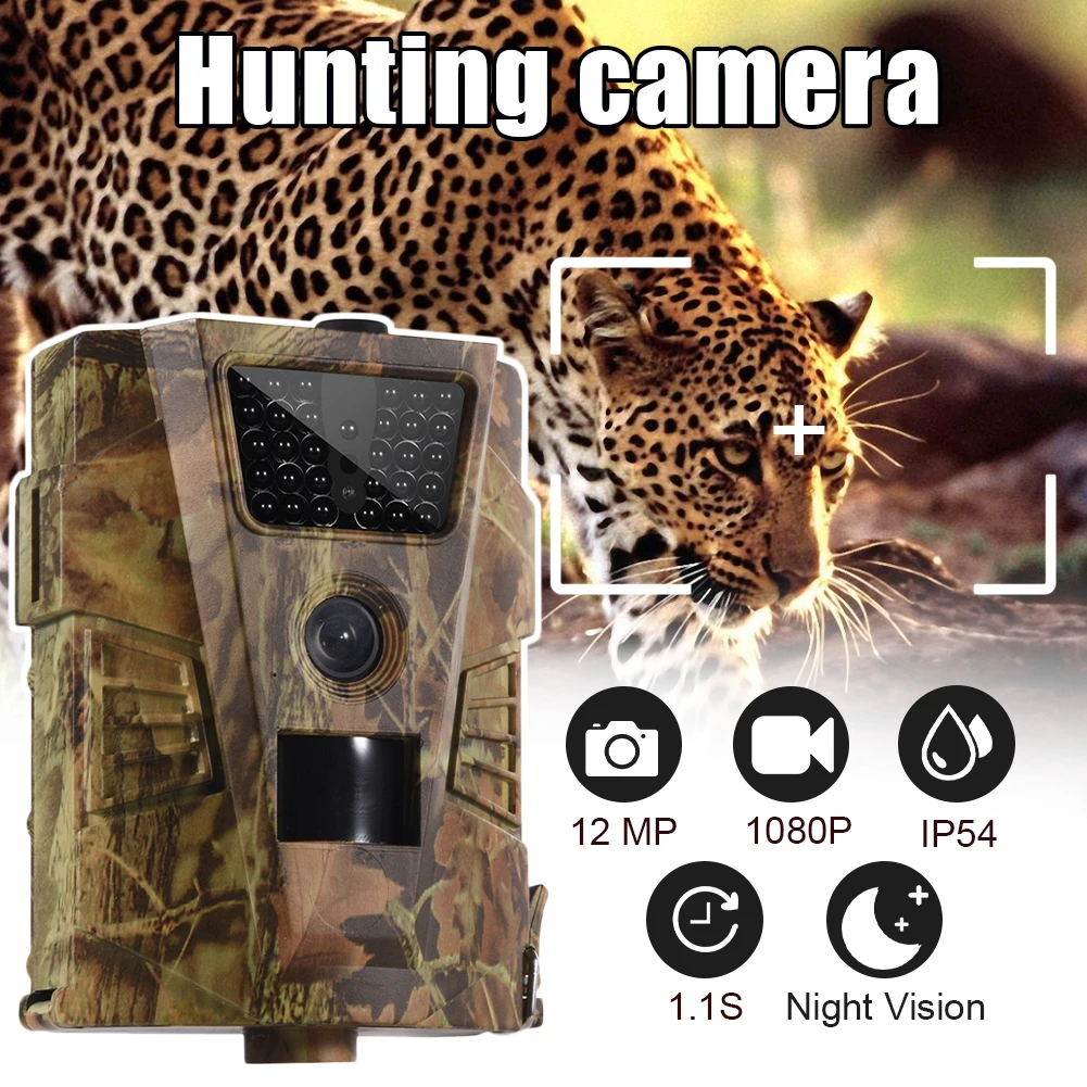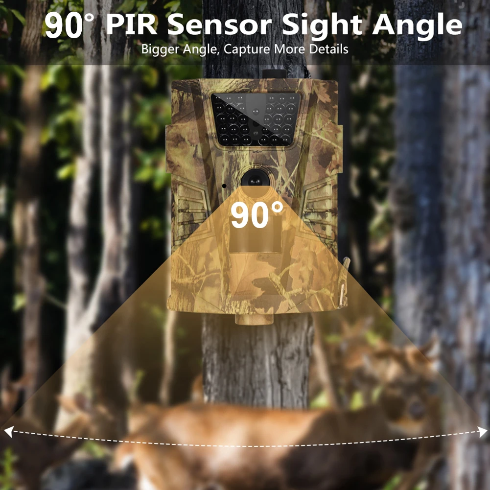 Камера с PIR датчиком 1,120 градусов, поддержка 12MP/ 8MP / 5MP Выбор разрешения изображения, 1080P 30fps видео. Инфракрасная камера для съемки диких животных.