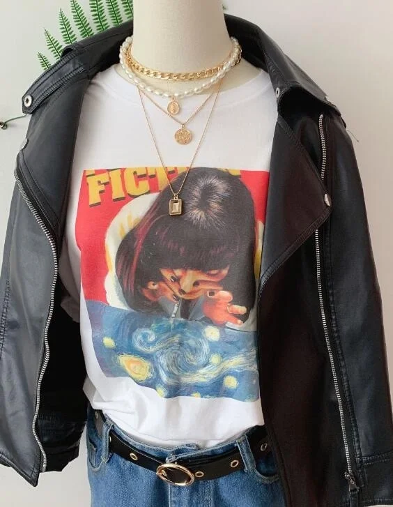 Sunfiz HJN Криминальное чтение Звездная ночь унисекс футболки Мии Уоллес фильм футболка Женская Harajuku Ullzang 90-х Корейская футболка