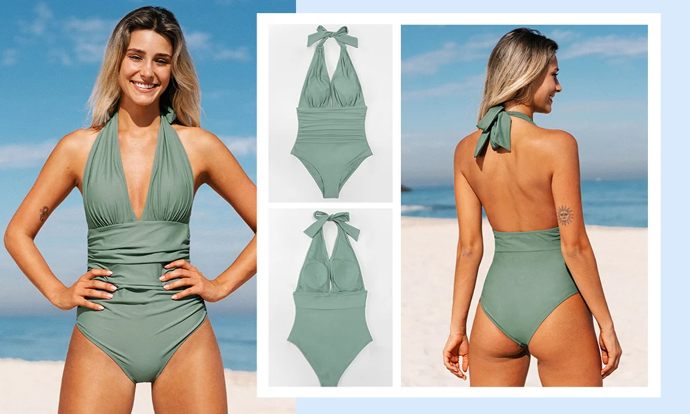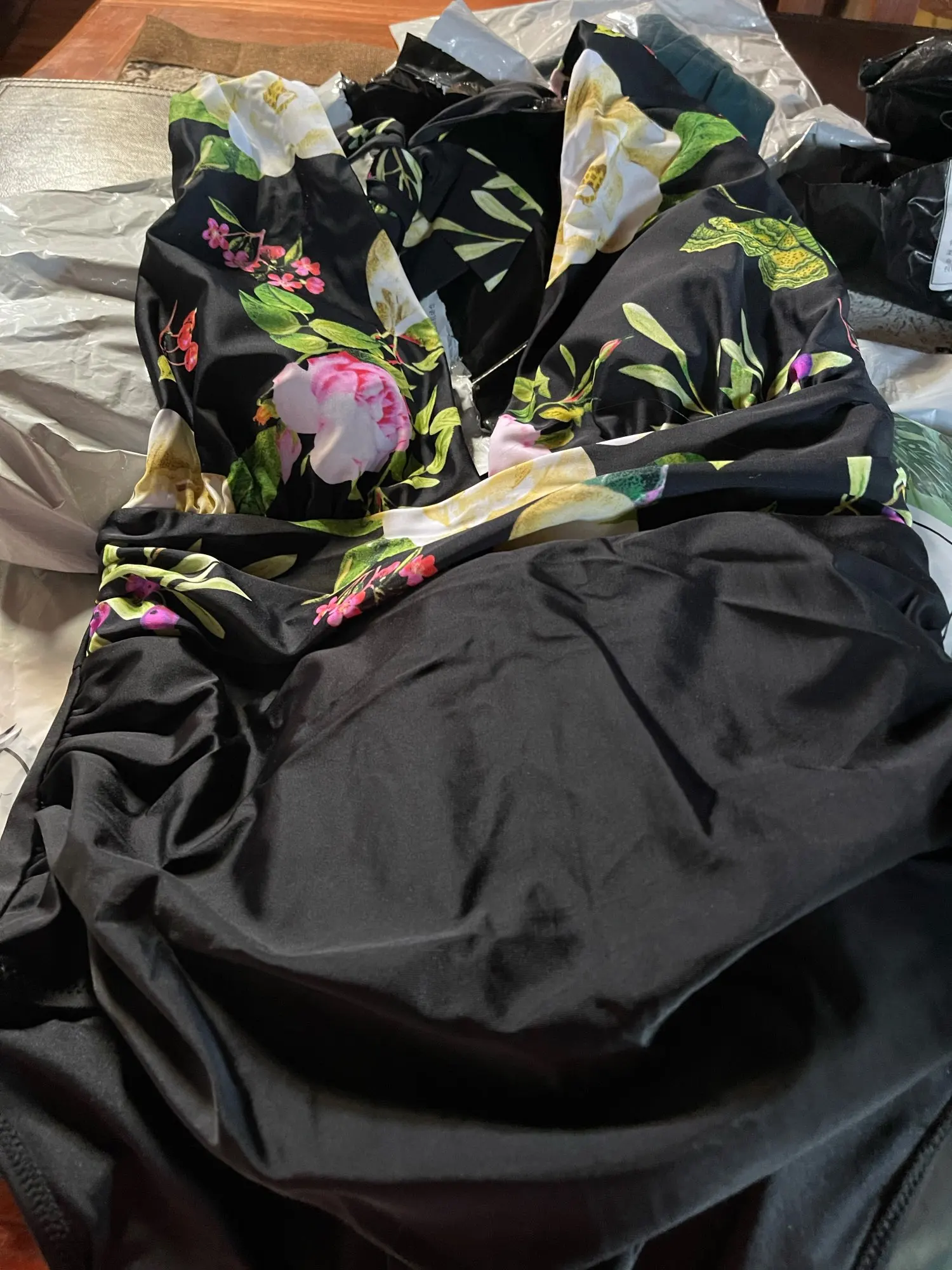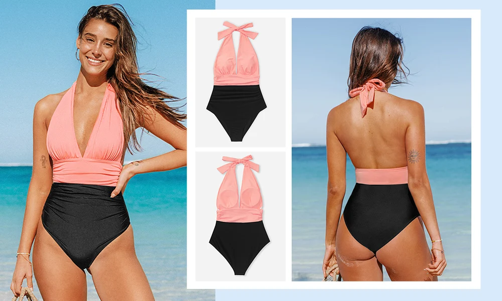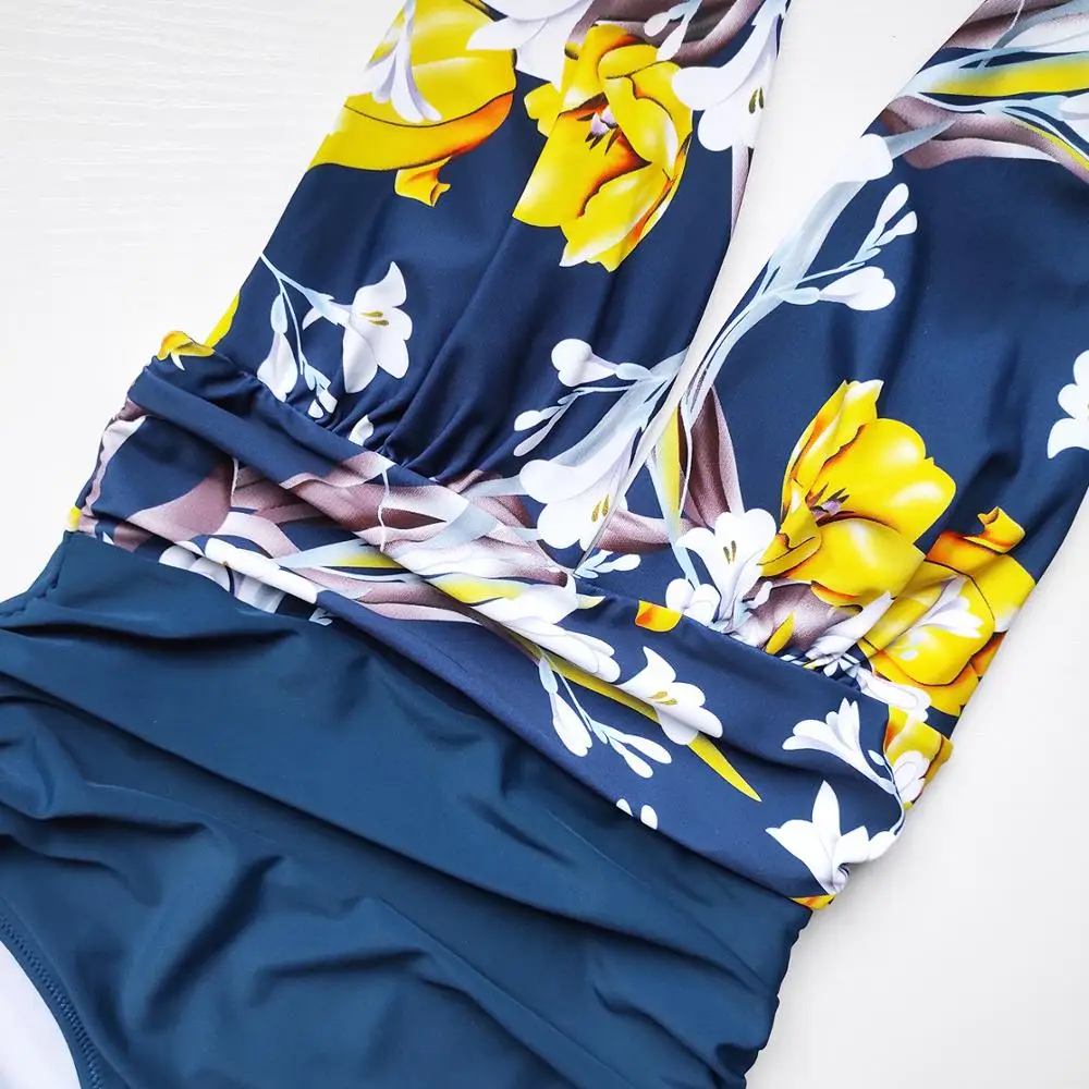 О так забавно, этот темно-синий цветочный глубокий v-образный Вырез Холтер цельный купальник сделан для вас. Этот купальный костюм, Подчеркивающий фигуру, контрастирует с темно-синим цветком и однотонным для элегантного купального стиля. Присборенная Талия обеспечивает подчеркивающий живот охват, в то время как самозавязывающиеся ремни позволяют регулировать подгонку и поддержку бюста.