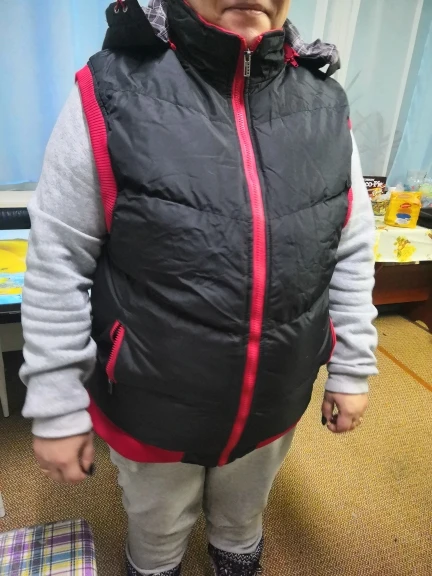 Качественная жилетка Ткань хорошая Синдипона не пожалели Покрой прямой, внутри слева карман( это плюс) на объём груди 110 см подошёл нормально 5 xl По низу трикотажный манжет