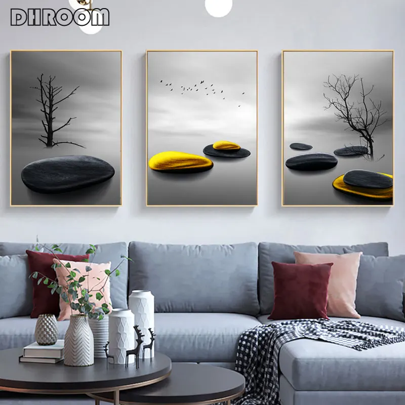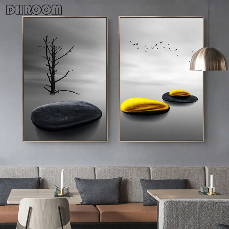 Современный минималистичный пейзаж, принты деревьев и птиц, Постер, скандинавский золотой камень, холст, живопись, Настенная картина, декор для гостиной