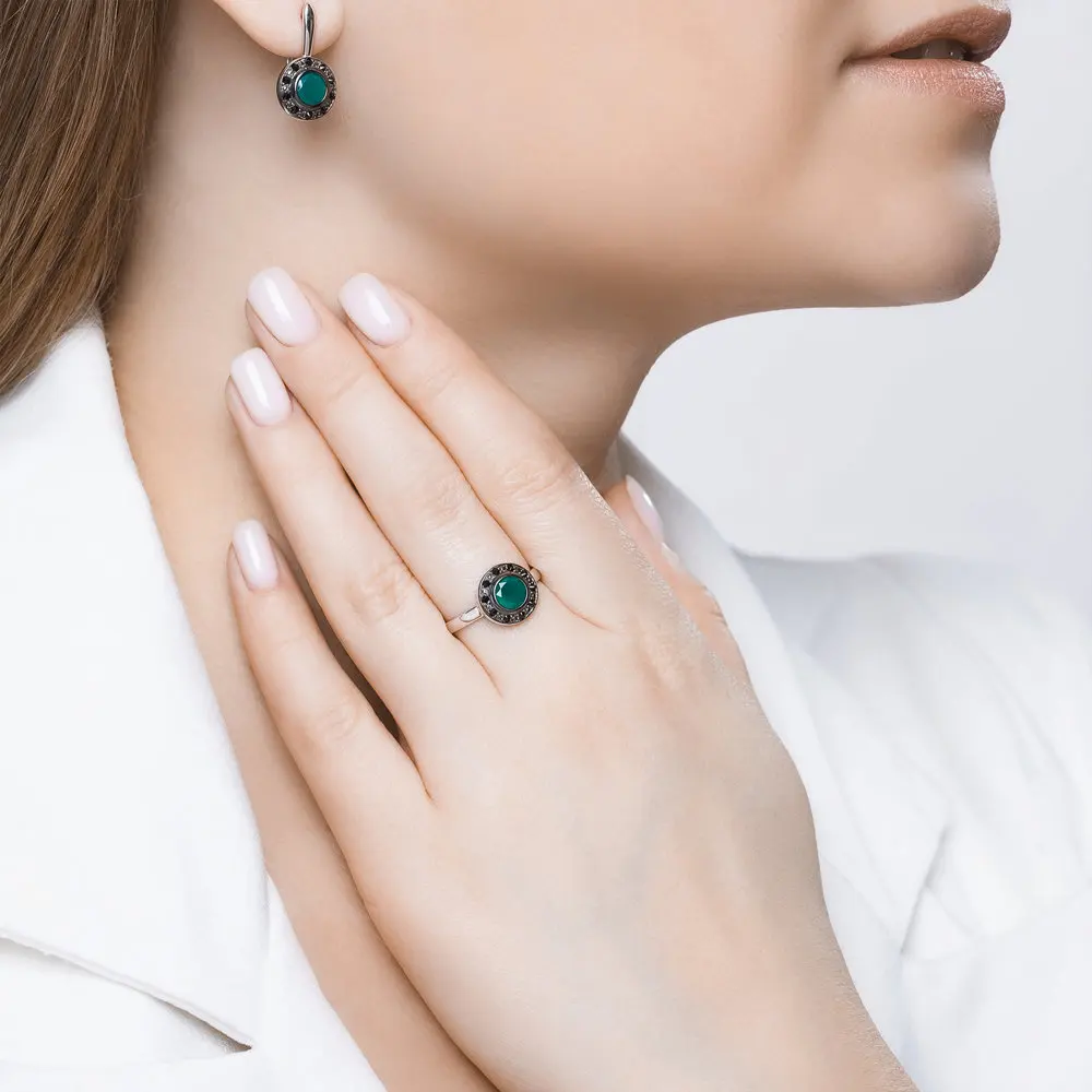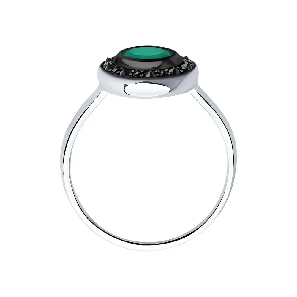 Кольцо SOKOLOV из серебра с агатом и фианитамиКольцо из серебра с агатом – акцентный аксессуар, который призван подчеркнуть ваш вкус и стиль. Центральным декоративным элементом стал агат необыкновенного изумрудного цвета, чья красота подчёркнута круговой россыпью чёрных камней. Дизайнерский приём игры на контрастах усиливает металл холодного оттенка. В сочетании с серьгами аналогичного дизайна вы получаете эффектный ювелирный сет для будней и праздников.