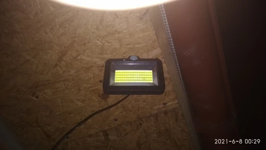 Всё работает. Светит даже слишком ярко - сложно поставить так, чтобы не слепил. Странным образом провод солнечной батарее при сборке был защемлен в ее корпусе, т.с. странная и неаккуратная сборка