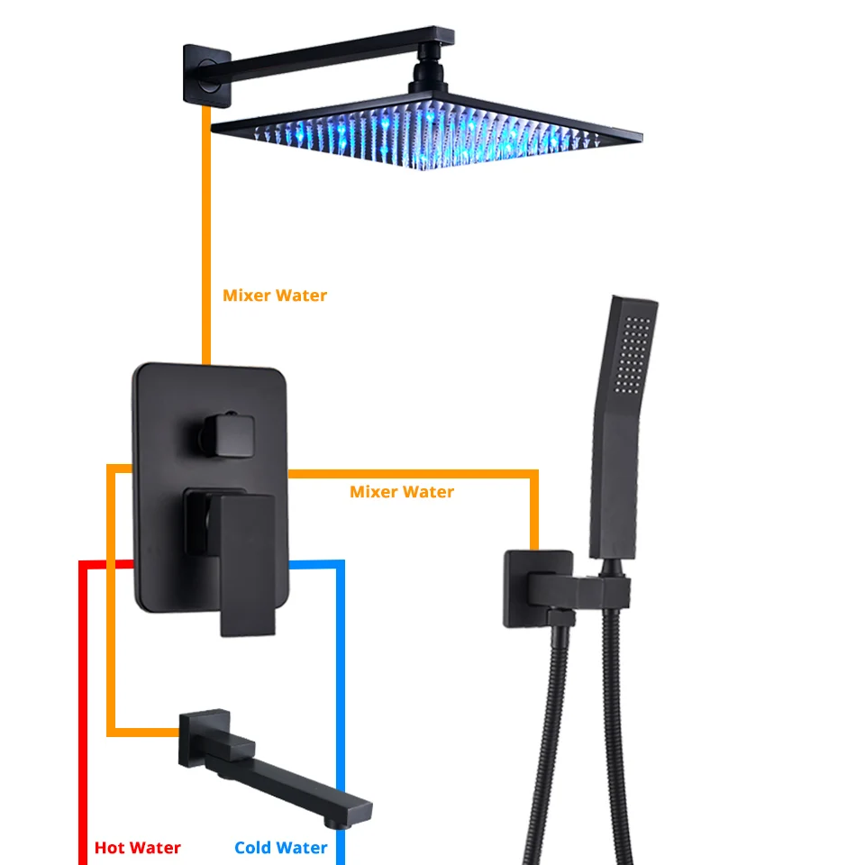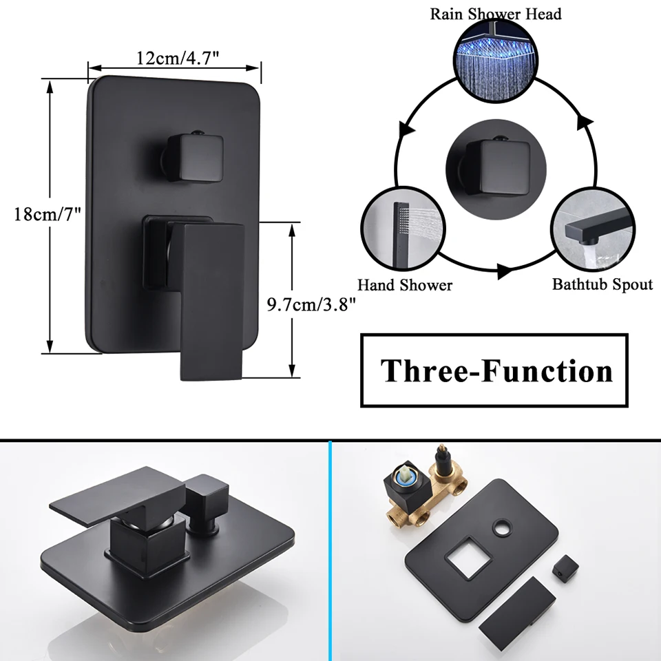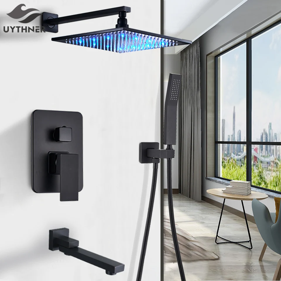 Матовый черный смеситель для душа, светодиодный смеситель для душа с дождевой насадкой, настенный смеситель для ванны, смеситель для душа
