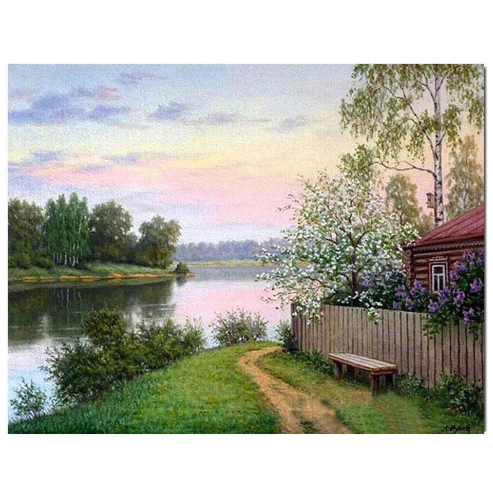 Алмазная вышивка, картина для дома в деревне, мозаика 5D сделай сам, живопись из страз, дерево, озеро, пейзаж, вышивка крестиком