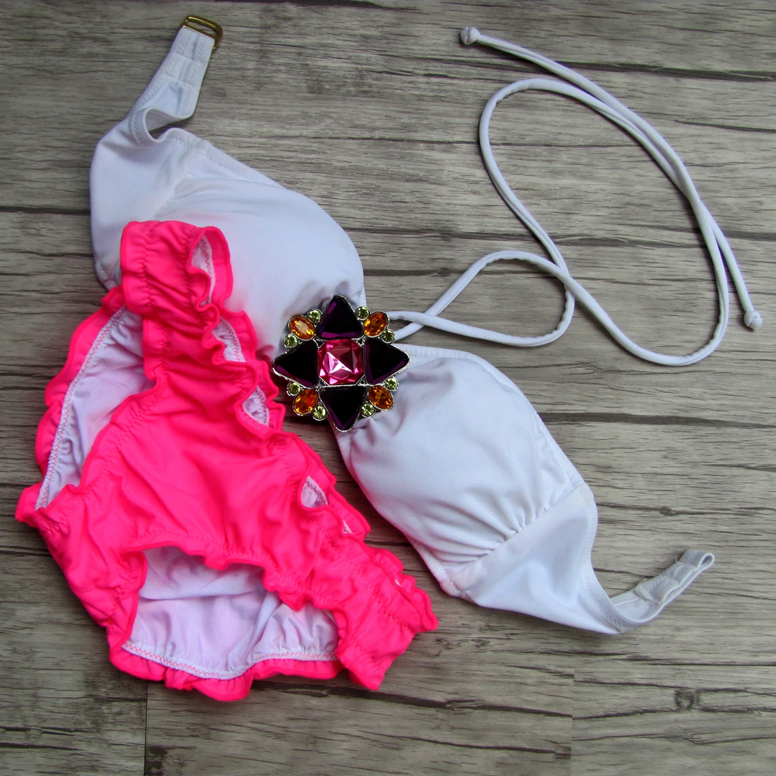 Дизайнерский комплект бикини с кристаллами и бриллиантами, белый купальник для женщин, купальник 2019, бикини с розовым низом, купальный костюм на заказ