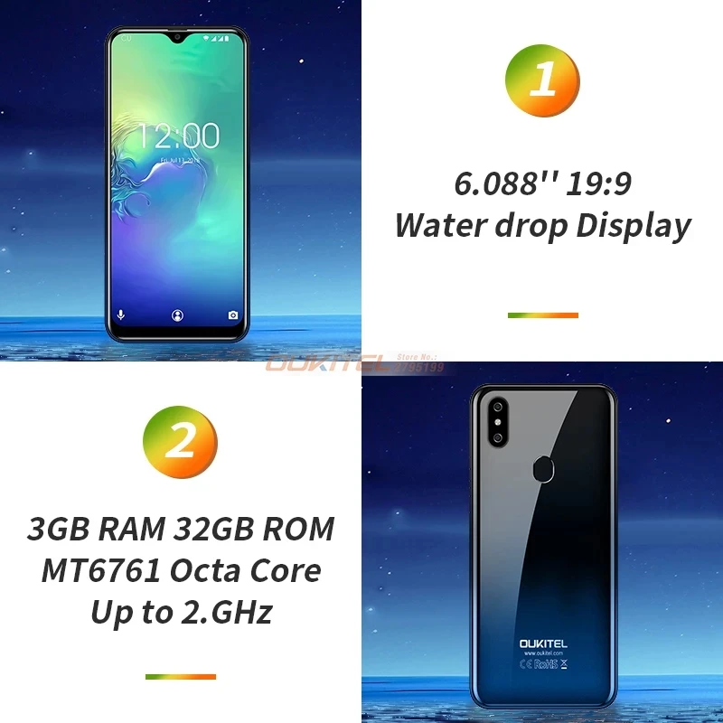 Смартфон OUKITEL C15 Pro +, 3 Гб ОЗУ 32 Гб ПЗУ, экран 6,088 дюйма 19:9, Android 9,0 Pie, MT6761 четыре ядра, 3200 мАч, 4G мобильный телефон