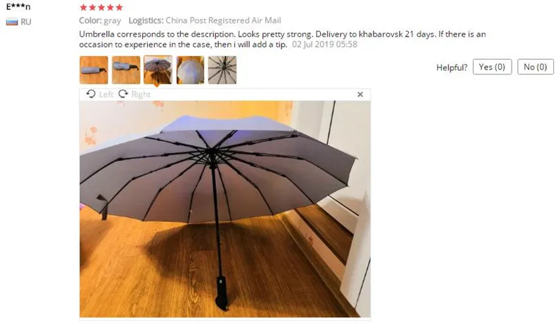 Долгая доставка. Доставка занимает 77 дней. Зонт кажется крепким. Прочные пружины-открывайте и плотно закрывайте (лучше не делать это слишком часто, так как на весну больше износа).