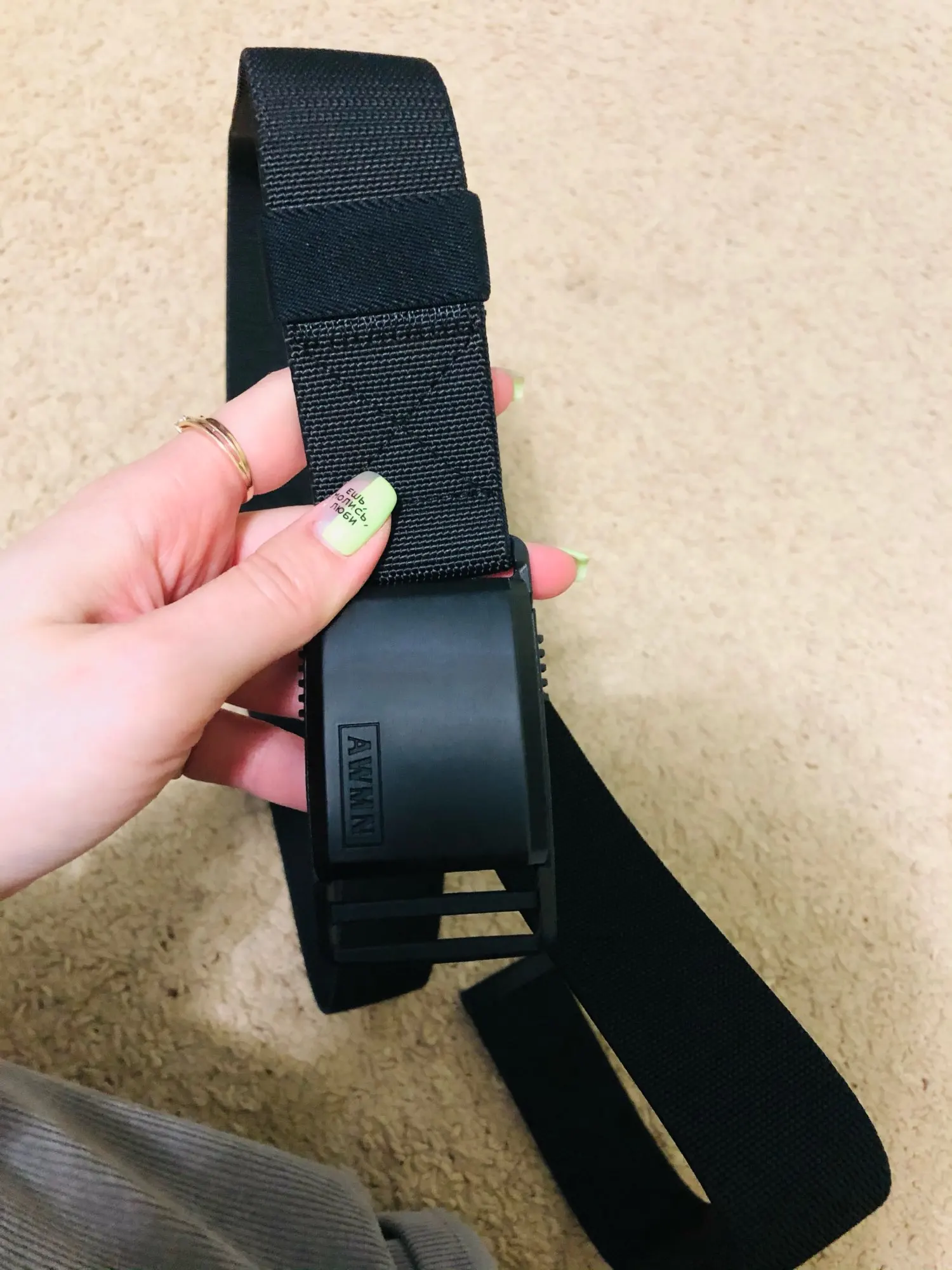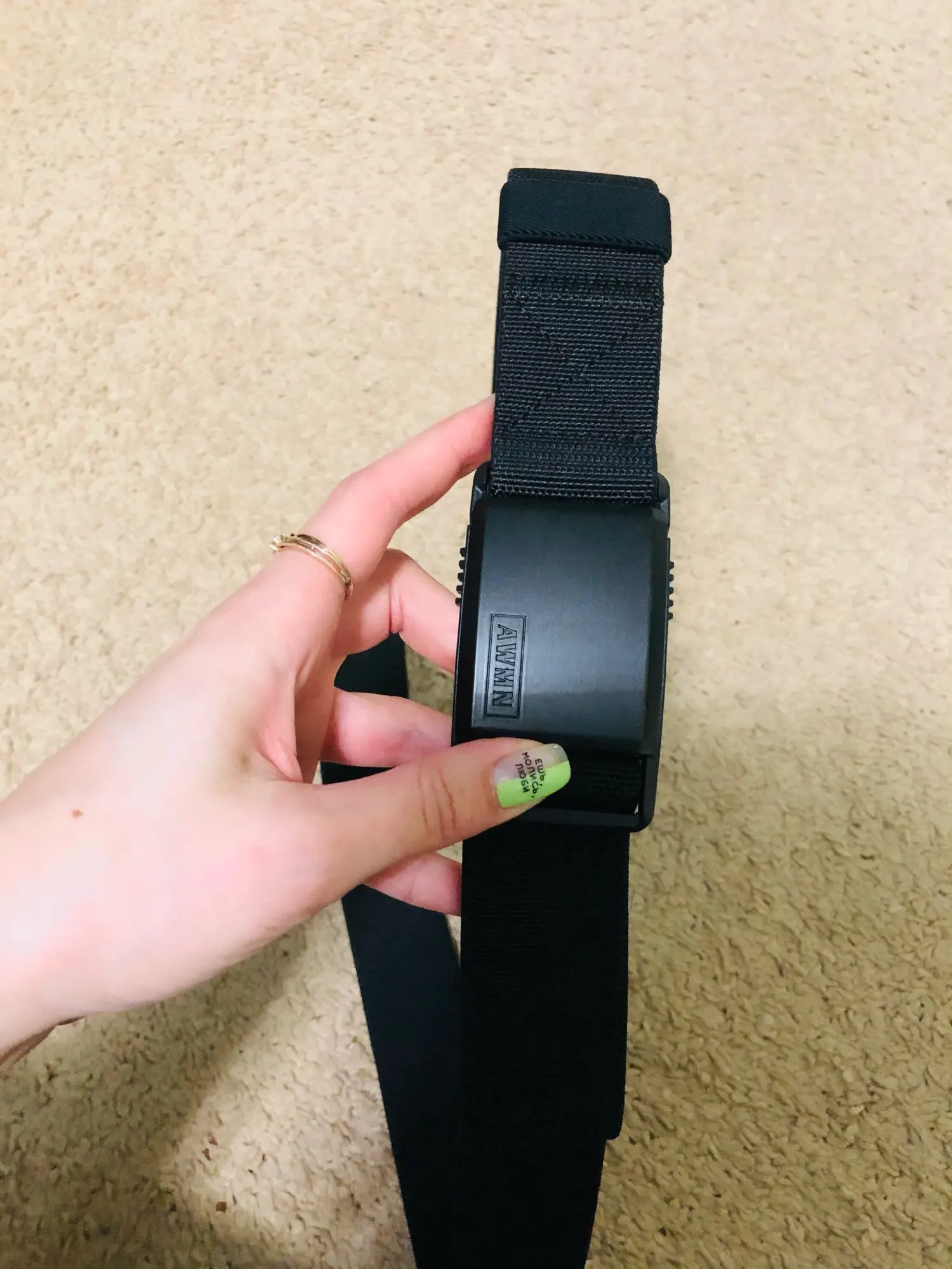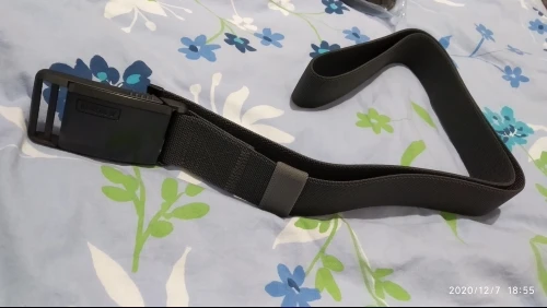Ремень отличный! Немного тянется, как и обещано, защёлка магнитная на зацепе. Единственное, что удивило - длина. Я им почти два раза обернулся. Но учитывая, что регулируется он один раз, проблем не возникло. Нагрузки держит - килограмма 2 висит на ремне, а ему хоть бы хны. Приятный ремень, пользоваться удобно. Про доставку не скажу - сейчас всё долго идёт, поэтому тут от продавца ничего не зависит.