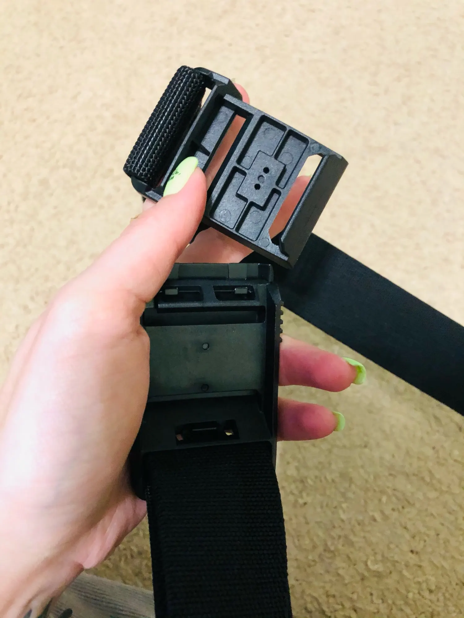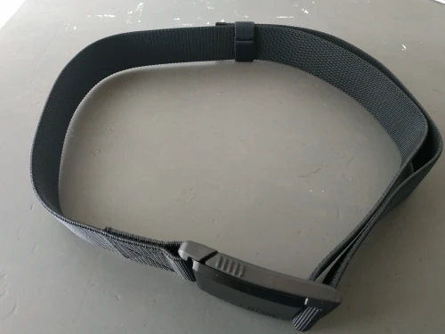 Выглядит очень хорошо, сделан качественно, застёжка выполнена из прочного пластика, с металлической декоративной накладкой. Принцип застёгивания достаточно прост, без постоянных продеваний, застёжка из двух половинок, один конец ремня просторчен, другой конец, один раз отрегулировал и больше не трогаешь. Регулировка не сбивается, засчет того, что ремень имеет свойство стрейча, туго, но немного растягиваеться.