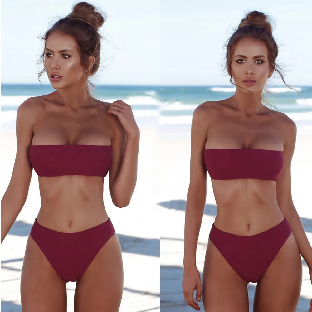 Модный женский купальник-бикини из двух частей, черный однотонный купальный костюм без бретелек, женский спортивный сексуальный купальник пуш-ап для бассейна 2020