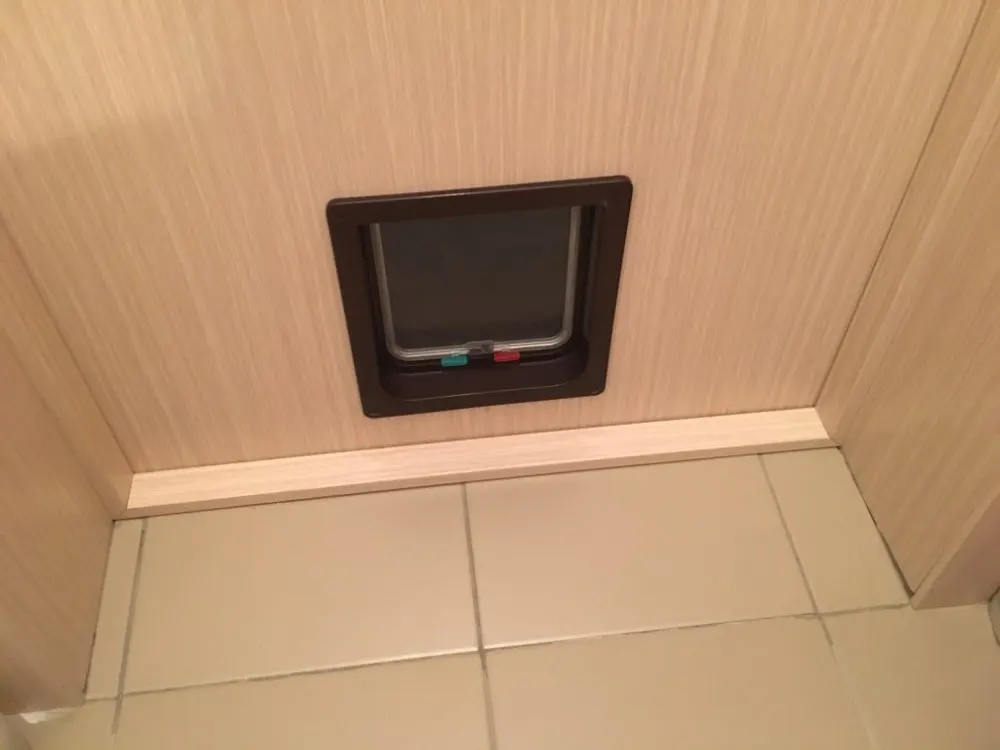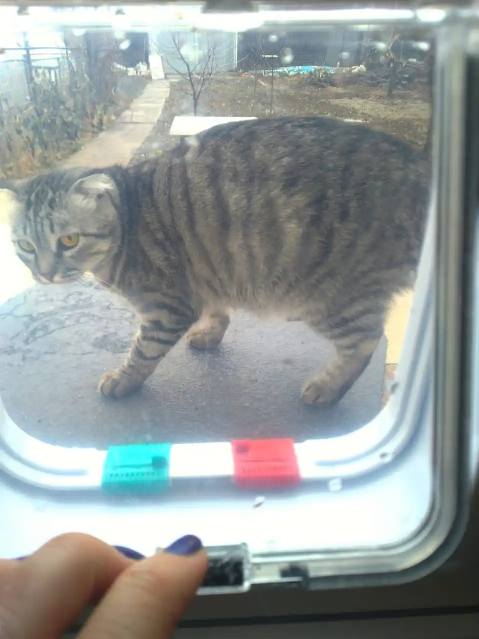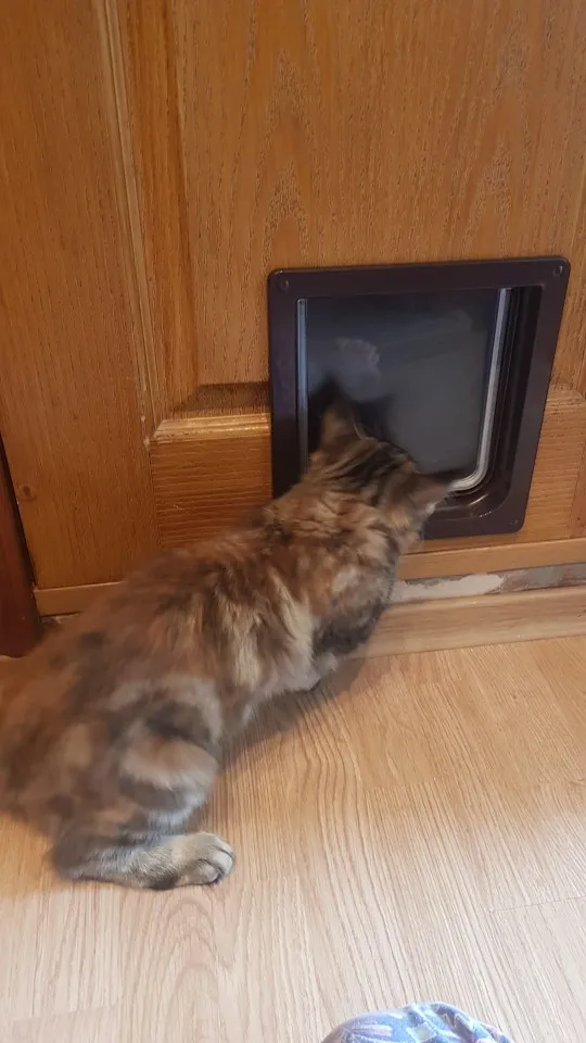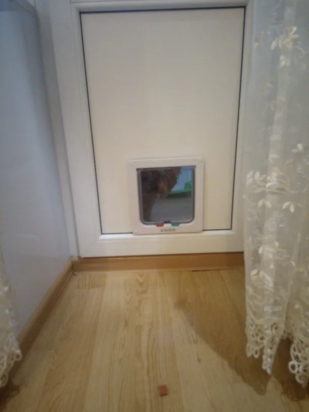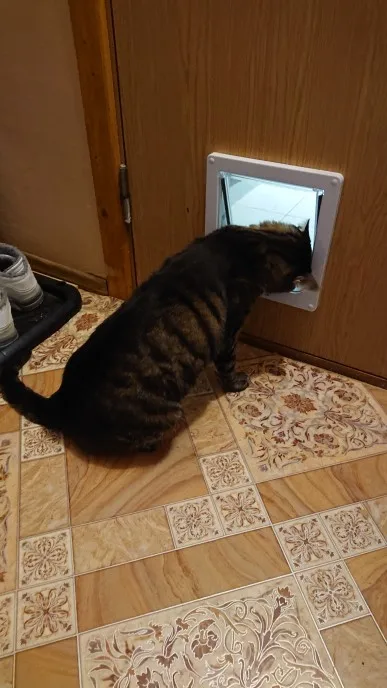 Берём уже такую вторую. Дверь удобная, установка простая. Магнит очень крепкий и прижимает хвосты котам, поэтому сняли его. Коты приучаются очень быстро ходить через свою дверцу. Только сначала снимаем "шторку", через пару дне ставим ее, а потом вообще тонируем, чтобы сами чувствовать себя комфортно.