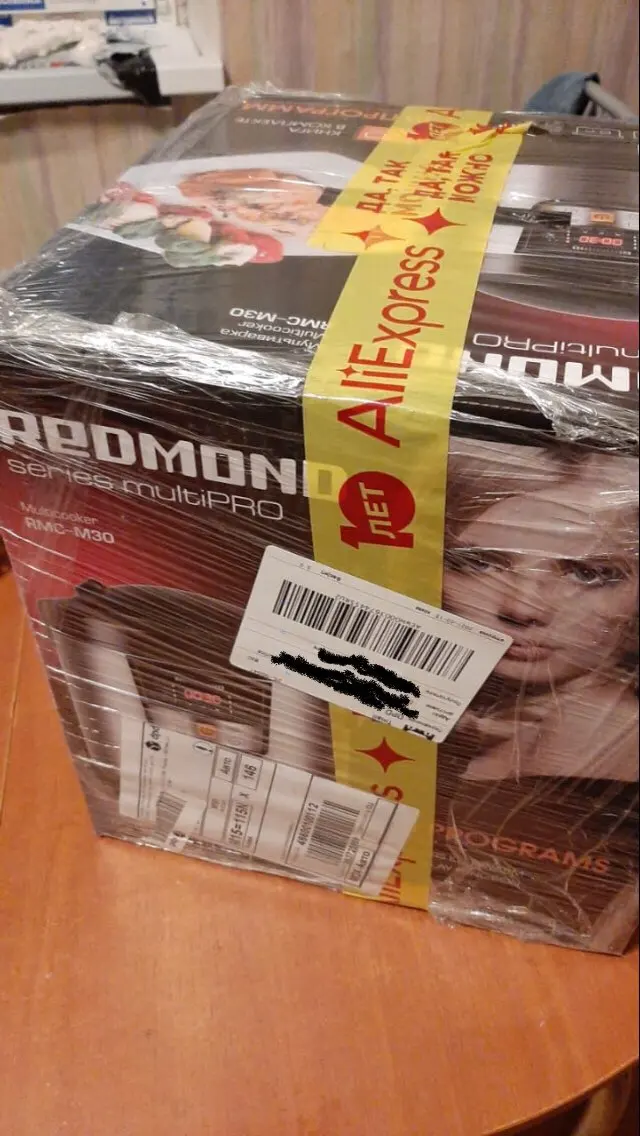 Быстро доставили в постамат в мск. Упаковка поверх оригинальной коробки - прозрачная пленка и фирменный скотч алиэкспресс. Вроде все работает, при первом включении завоняла но быстро выветрилось.