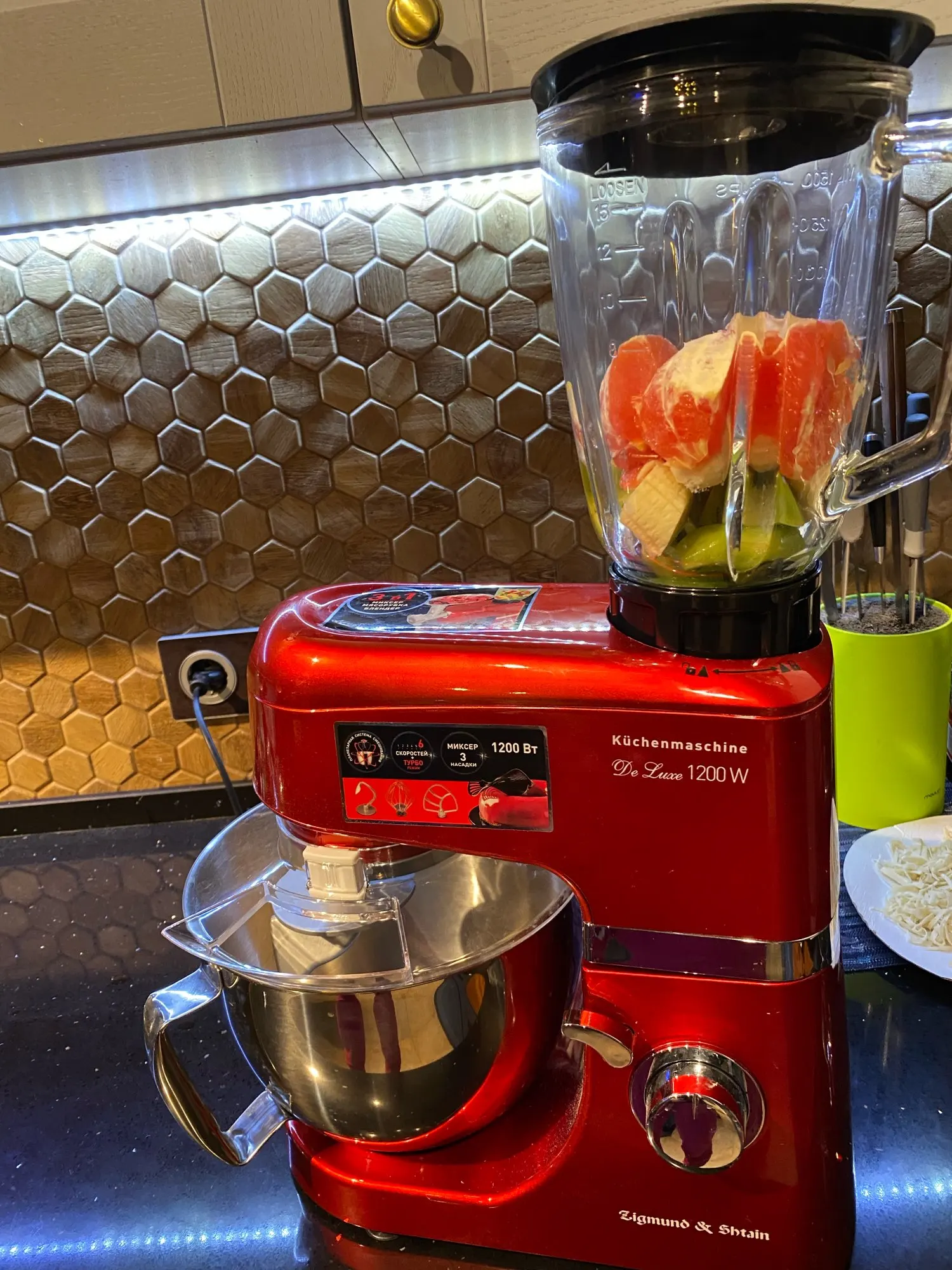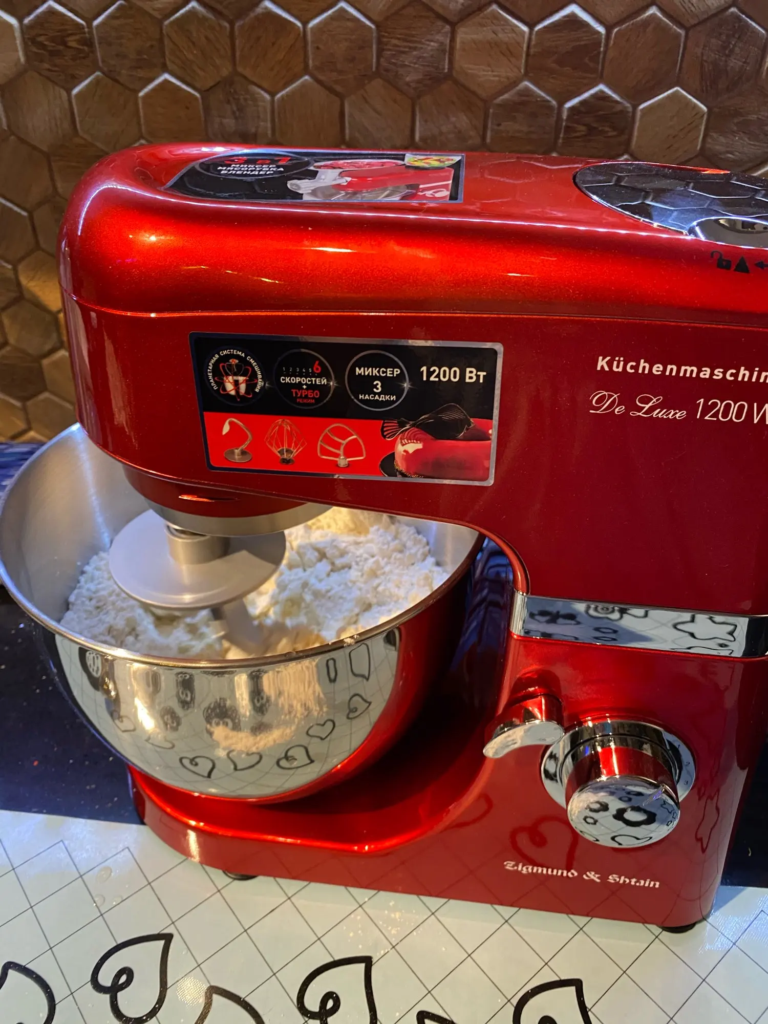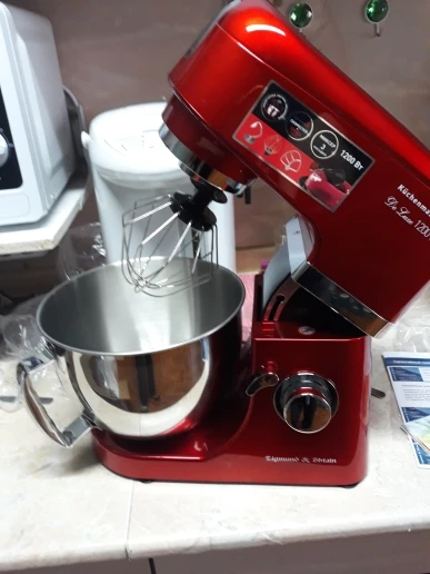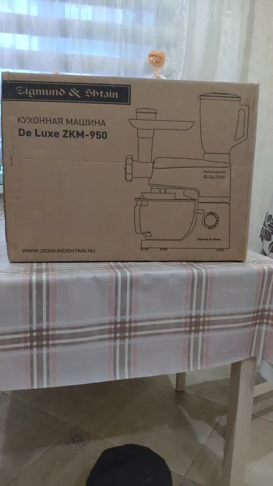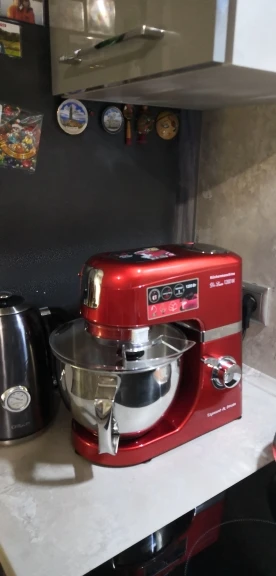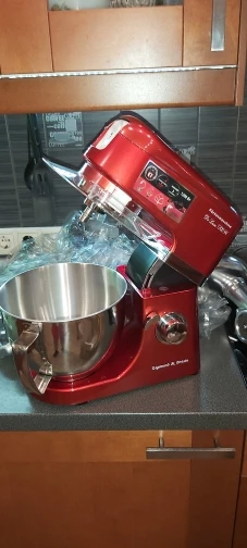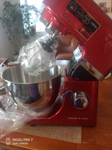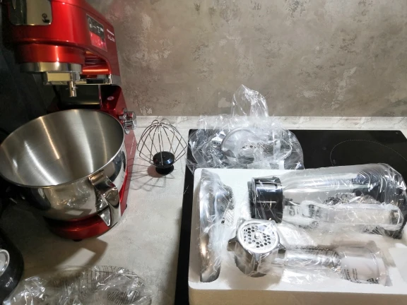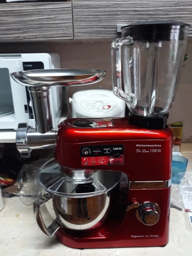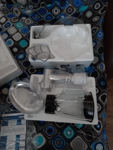 Очень доволен покупкой. Миксер оправдал мои ожидания, полностью соответствует описанию. Что касаемо скорости доставки, меня это сильно поразило. Вчера!!!! оплатил, а уже Сегодня!!!!! Днем привезли. Меньше суток - по Москве. Сборка достаточно качественная. Блендер и Миксер по работе - без нареканий. Не такой шумный, как говорили. Достаточно мощный. Венчик почти достаёт до дна чаши - 2мм, крюк - повыше но не критично, лопатка - тоже низко держится. К мясорубке только один вопрос - немного болтается в креплении, но не критично. При большей скорости после 3-ей комбайн начинает шататься, но присоски держат намертво))). Товар за такие смешные деньги и продавца рекомендую. Не пожалеете. смело берите. Фотоотчет прилагаю.