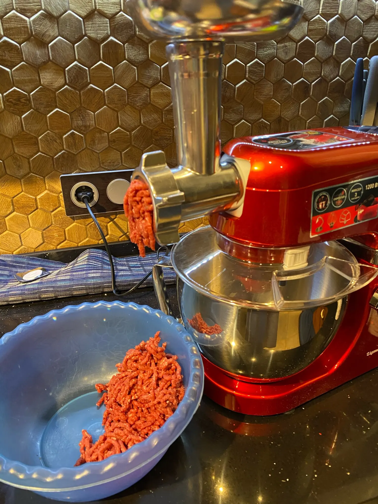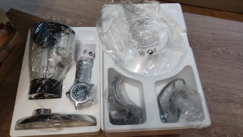 Это просто супер вещь! Доставка просто молния, при этом Почта России!!! Заказала 4.01, забрала на почте 6.01!!! Упаковон был в 2 коробки. Внутри каждая часть в отдельной пенопластовой коробочке, так что целостность 100% гарантированна. Инструкция на русском, поэтому, прежде чем снимать плёнку, прочтите ИНСТРУКЦИЮ, тогда не возникнет сложностей, как снять или прикрепить детали или чаши( как пишут некоторые). Очень прост в обращение. Я сразу перемолола мясо (плена срезать не стала, чтоб посмотреть как справится), на средней мощности меньше чем за минуту. Внешне выглядит очень красиво. На столе стоит очень устойчиво за счёт липучек. Но есть небольшой, на мой взгляд, минус - мясорубка во время работы трясётся, выглядит это очень ненадежно. Но на итоговом результате это не отразилось. Однозначно рекомендую к покупке!