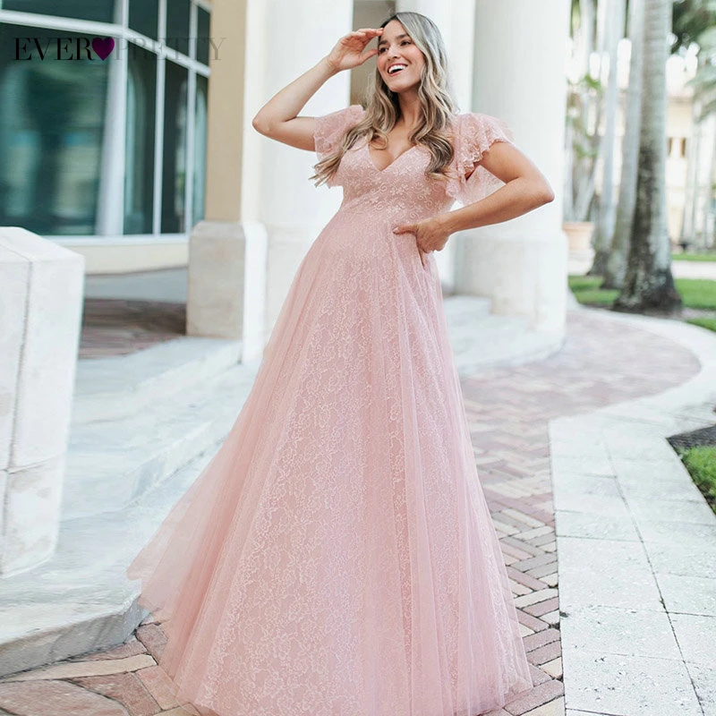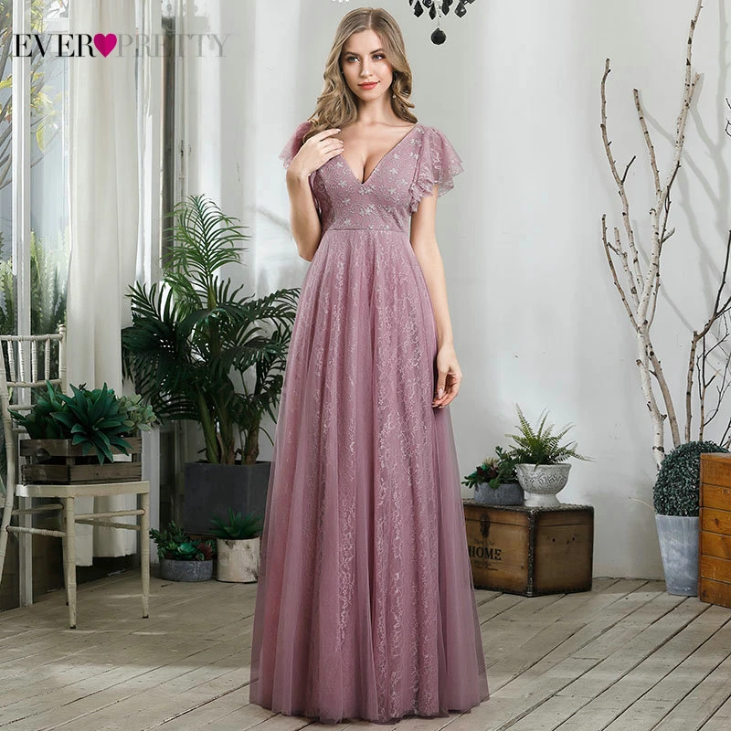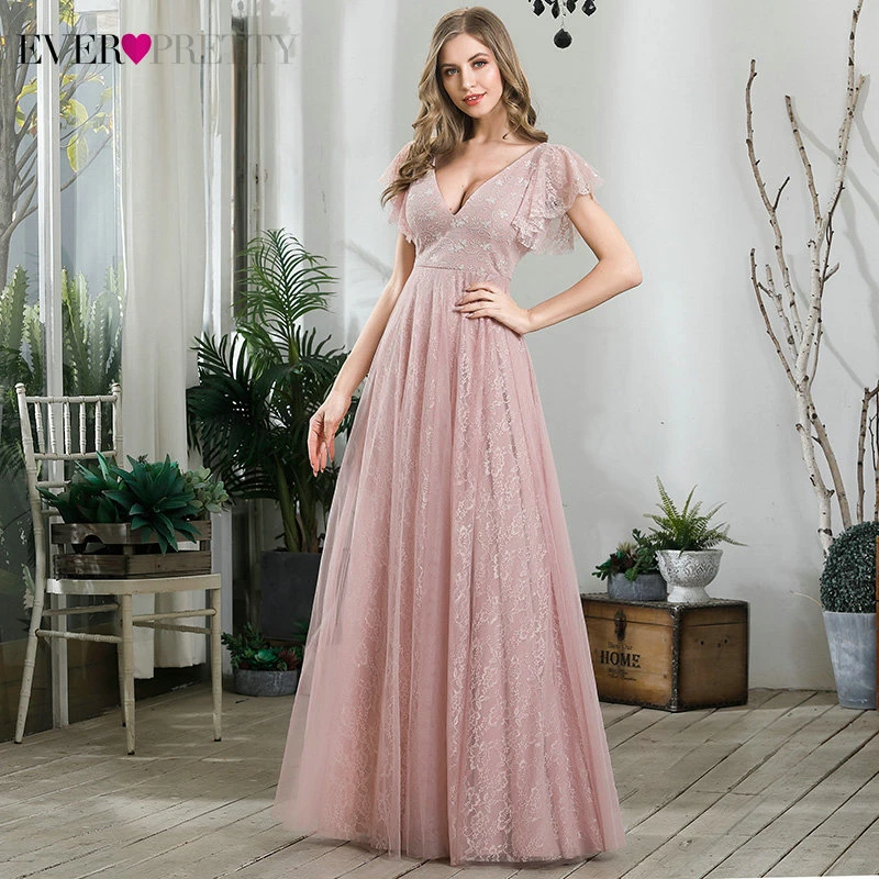 Платье Ever Pretty женское кружевное для выпускного вечера, длинное Тюлевое платье-трапеция с оборками и рукавами, с глубоким V-образным вырезом, EP00857PK, 2020