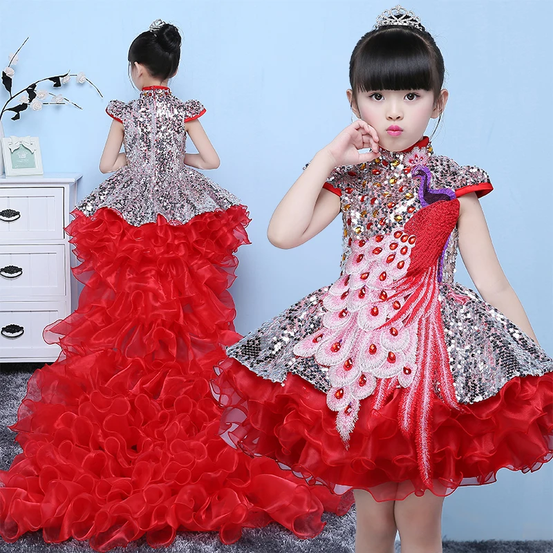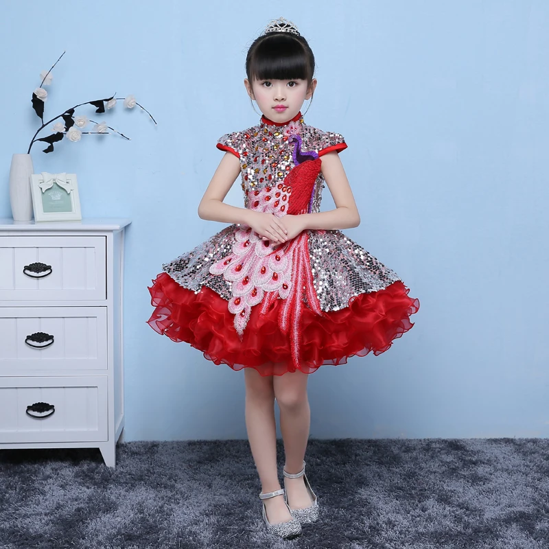 Платье с красным павлином для девочек; Платье подружки невесты на свадьбу; Костюмы для выступлений; Детское платье принцессы на день рождения