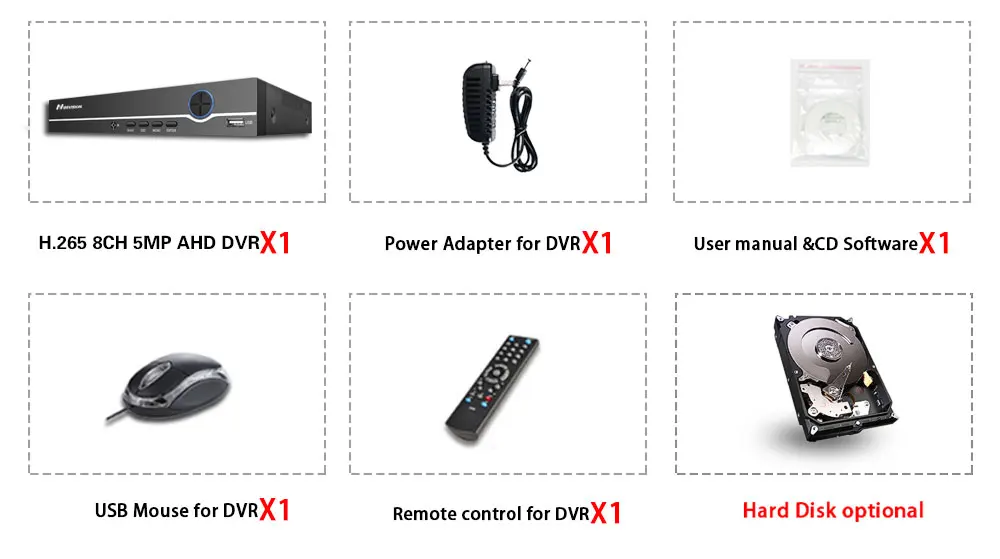 1 х H.265 8CH 5.0MP 6 в 1 AHD DVR гибридный цифровой видеорегистратор1 x Блок питания для DVR1 х USB мышь для DVR1 X CD программное обеспечение для DVR1 X пульт дистанционного управления для DVRЖесткий диск опционально!
