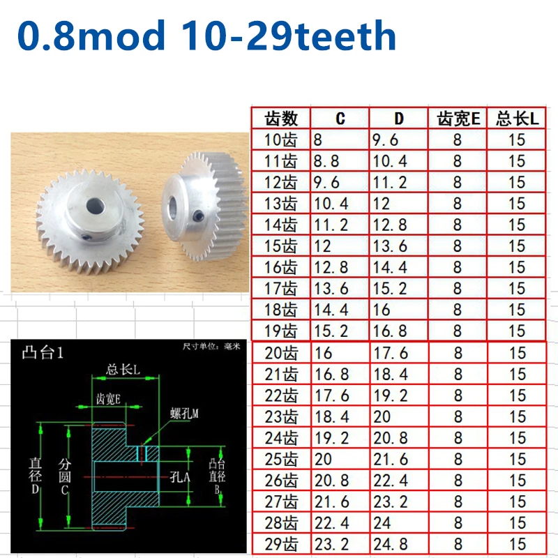Выпуклый шаг из алюминиевого сплава 0,8 mod 12t 13t 14t 15t 16t 17t 18t 19t 20t 21t 22t 23t 24 25t 26t 27t 28t 29t зубчатая цилиндрическая шестерня