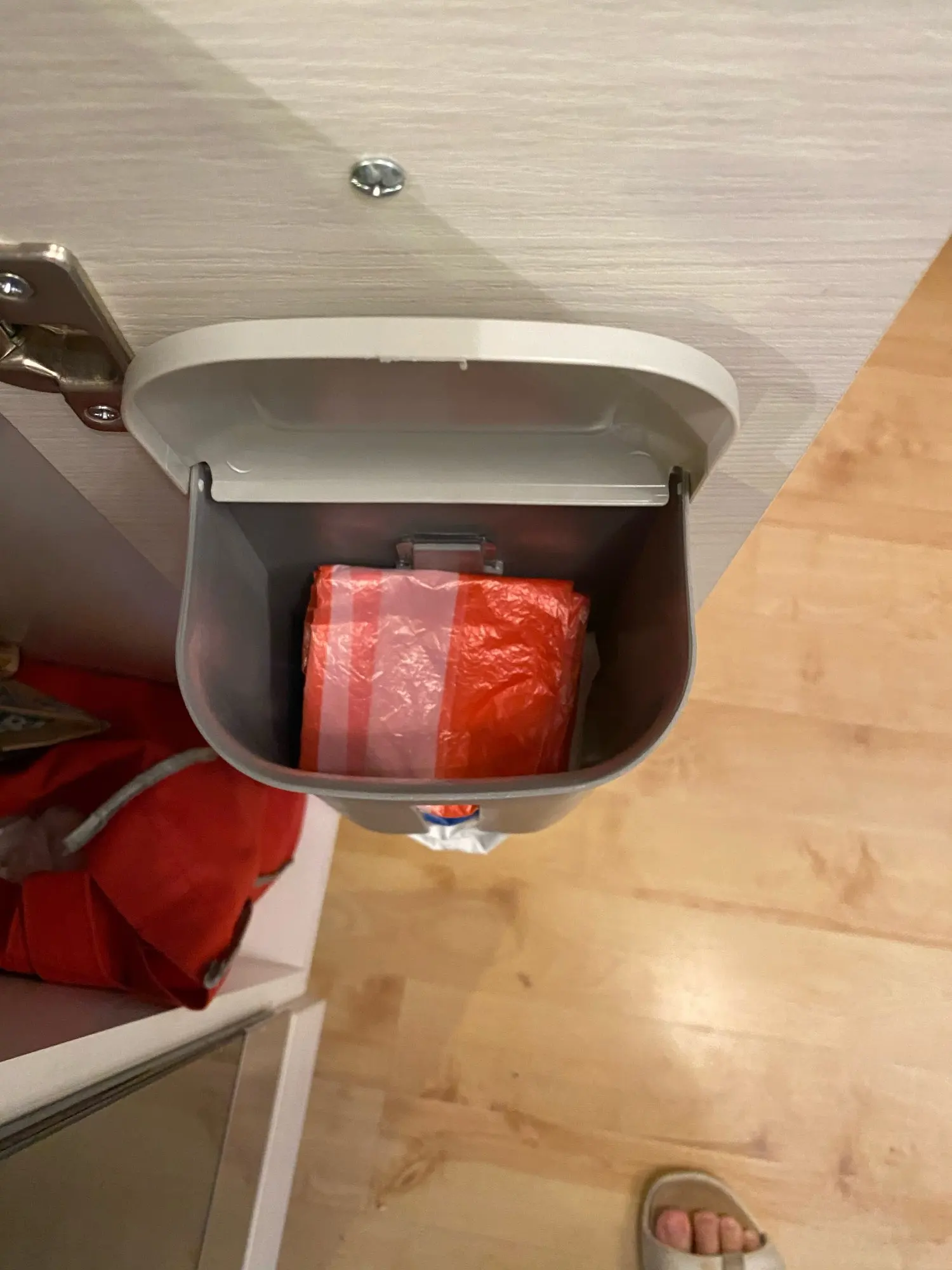 Классная вещь. По размеру не маленькая, пакетов туда уйдёт огромное количество.