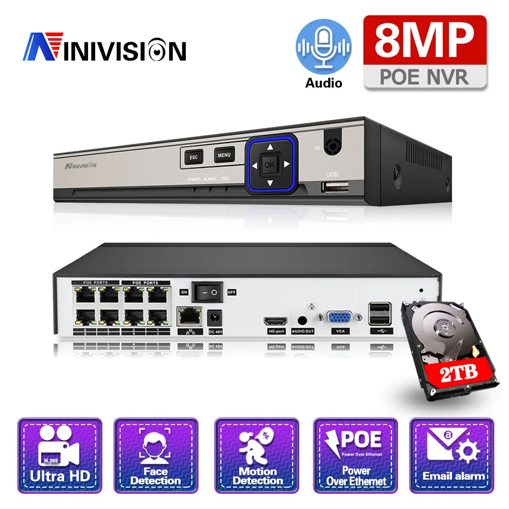 8MP Распознавание лиц 4CH 8CH POE 4 к NVR H.265 NVR Сетевой Видео Регистраторы 8-канальный сетевой видеорегистратор 1 HDD 24/7 записывающая IP камера 2,6 P2P Системы